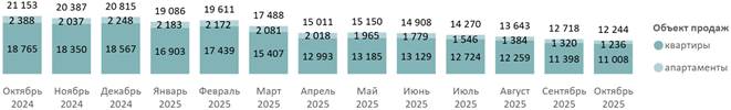 По подсчетам аналитиков «Метриум», средневзвешенная цена квадратного метра квартир и апартаментов по итогам октября 2025 года составила 387 450 руб. (+4% за месяц, +17% за год). Средневзвешенная цена квартир – 394 290 руб. за кв. м (+4% за месяц, +18% за год), апартаментов – 315 530 руб. за кв. м (+2% за месяц, +12% за год).