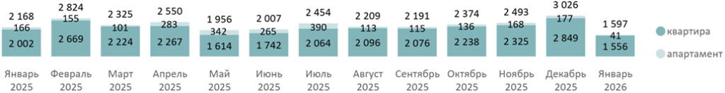 В январе 2026 года на рынке новостроек массового сегмента было зарегистрировано 1,6 тыс. ДДУ (-47% за месяц, -26% за год).