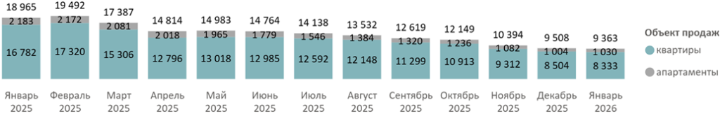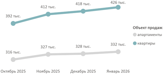 По подсчетам аналитиков «Метриум», средневзвешенная цена квадратного метра квартир и апартаментов по итогам января 2026 года составила 417 640 руб. (+2% за месяц, +24% за год). Средневзвешенная цена квартир – 426 470 руб. за кв. м (+2% за месяц, +24% за год), апартаментов – 332 080 руб. за кв. м (+1% за месяц, +19% за год).