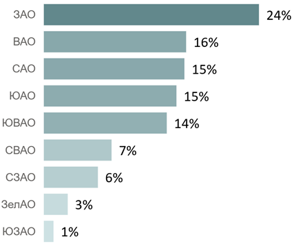 В январе максимальное число сделок было зарегистрировано в ЗАО (24%, -2 п.п. за месяц), второе место по числу сделок приходится на ВАО (16%, без изменений за месяц), третью позицию занимает САО (15%, +3 п.п.). По продажам в сегменте лидируют: «Лучи» (301 ДДУ), «Молжаниново» (86 ДДУ) и «Метроном» (74 ДДУ).