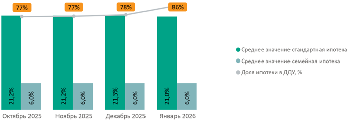 Доля сделок с привлечением ипотечного кредита в январе составила 86% (+8 п.п. за месяц). Средняя ставка по рыночной ипотеке за месяц сократилась на 0,3 п.п.