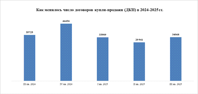 По итогам третьего квартала 2025 года на рынке было заключено 34,1 тыс. договоров купли-продажи. Этот результат на 5% уступает показателю третьего квартала 2024 года (35,7 тыс.), что говорит о том, что летнее замедление активности оказалось более глубоким, чем годом ранее, и сентябрьский рост не смог полностью его компенсировать.
