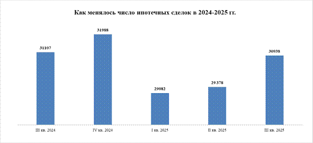 В целом по итогам третьего квартала 2025 года было заключено 30,9 тыс. ипотечных договоров. Этот показатель всего на 1% уступает результату третьего квартала 2024 года (31,1 тыс.).