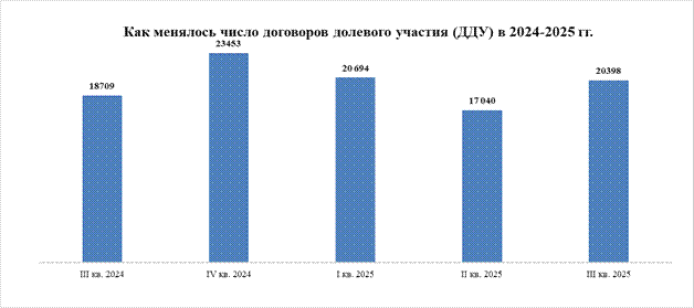 По итогам третьего квартала 2025 года было зарегистрировано 20,4 тыс. ДДУ. Этот результат на 9% превышает показатель третьего квартала 2024 года (18,7 тыс. ДДУ), что говорит о восстановлении рынка после резкого спада во втором квартале (-37% в годовом выражении).