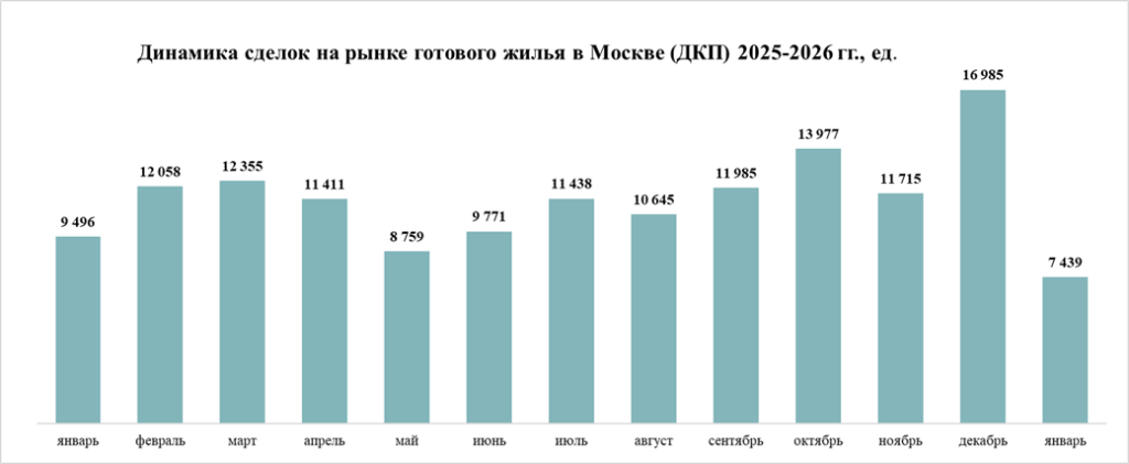 На рынке готового жилья (введенные в эксплуатацию новостройки и вторичное жилье) в январе 2026 года было зарегистрировано 7,4 тыс. договоров купли-продажи, что на 22% меньше, чем в январе 2025 года, когда было зафиксировано 9,5 тыс. сделок. Относительно декабря 2025 года, когда Росреестр Москвы зарегистрировал 17 тыс. соглашений, спрос уменьшился на 56%. Падение как в годовом, так и в месячном выражении оказалось заметно более глубоким, чем год назад: в январе 2025 года спад к декабрю составлял 45%, а рост к январю 2024 года достигал 27%.