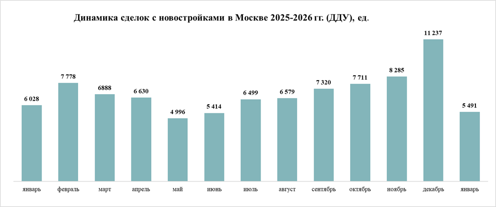 В январе 2026 года, согласно данным Росреестра Москвы, количество сделок на рынке строящегося жилья составило 5,5 тыс. договоров долевого участия (ДДУ), что на 9% меньше, чем в январе 2025 года, когда было зафиксировано 6 тыс. ДДУ. Относительно декабря 2025 года число соглашений снизилось на 51% – с 11,2 тыс. ДДУ, что характерно для зимнего периода, когда в первый месяц года спрос резко падает относительно пикового декабря.