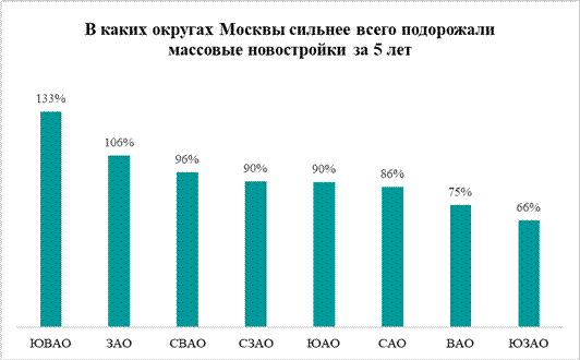 В массовом сегменте новостроек самый заметный рост цен зафиксирован в Юго-Восточном административном округе, где средняя стоимость квадратного метра увеличилась на 133%. Если пять лет назад она составляла 170,9 тыс. рублей, то сейчас достигла 399 тыс. рублей. При этом только за последние 12 месяцев новостройки в ЮВАО подорожали на 25%. Второе место занимает Западный административный округ (рост на 106%). Здесь за пять лет цена квадратного метра выросла с 222 тыс. до 457,8 тыс. рублей, а годовая динамика составила 21%. Замыкает тройку лидеров Северо-Восточный административный округ с подорожанием на 96% – с 200,8 тыс. до 392,9 тыс. рублей. За последний год цены в СВАО увеличились на 22%.