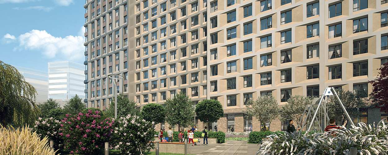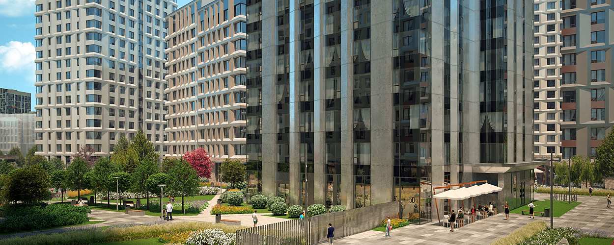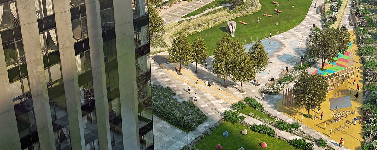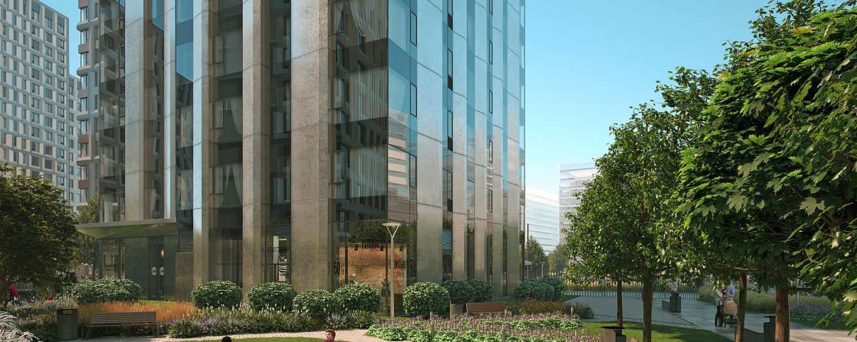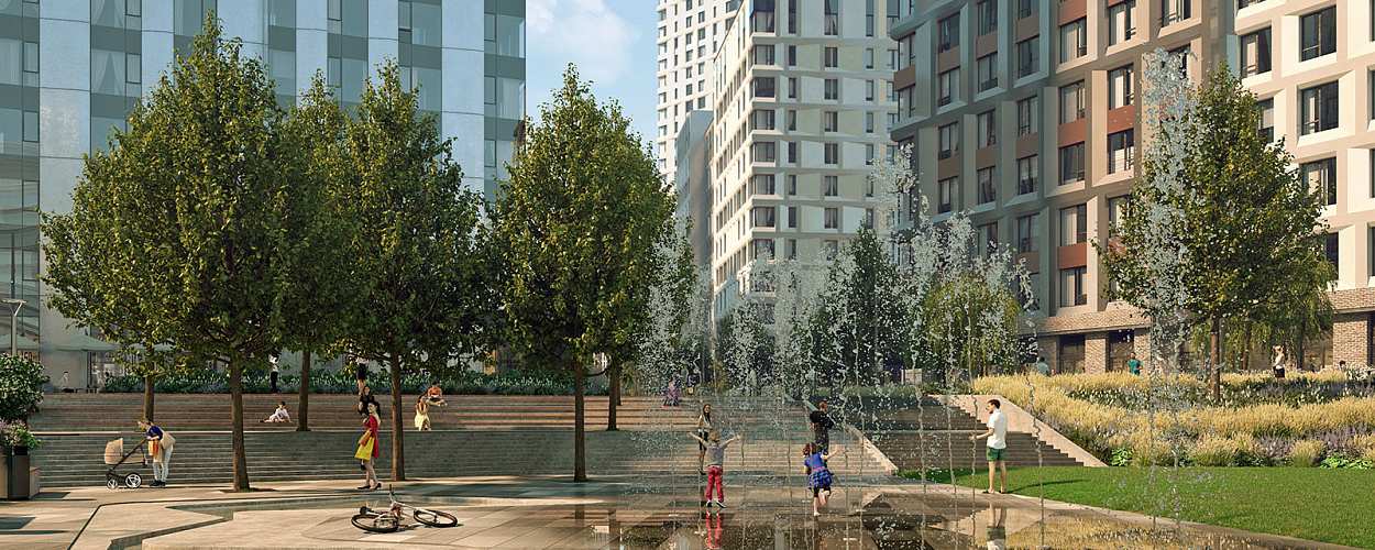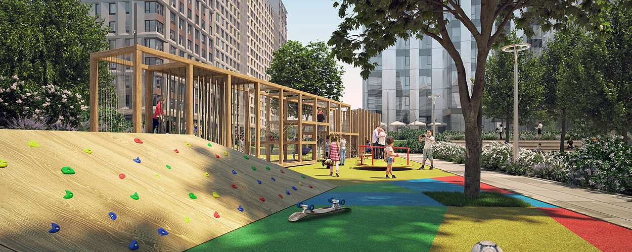 Новый жилой район спроектирован в концепции «двор без машин». На закрытой охраняемой территории разместятся подземные паркинги, зоны для отдыха, дорожки для бега, спортивные и детские площадки и зеленые зоны общей площадью 19,5 га. Жители смогут прогуливаться в центральном парке и по благоустроенной набережной Москвы-реки.