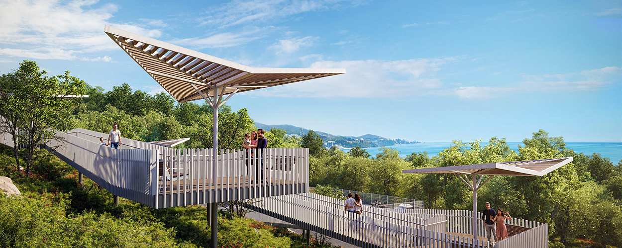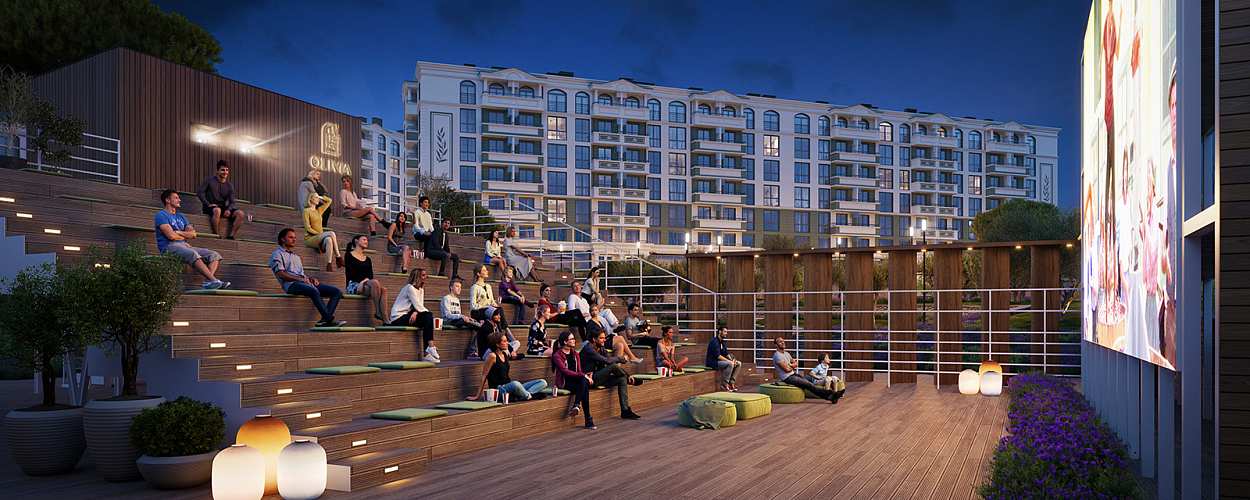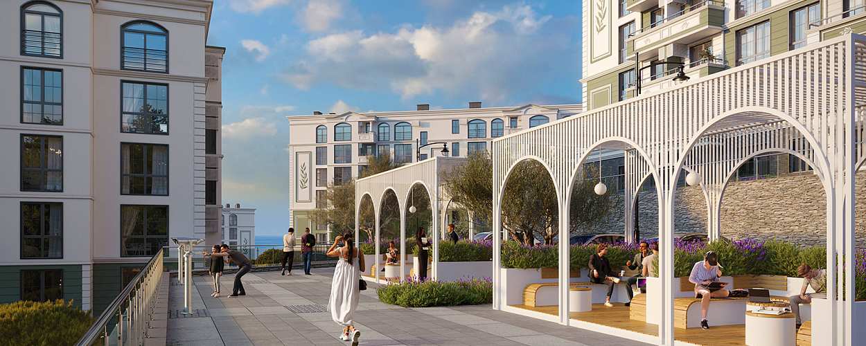 На территории комплекса расположен оливковый сад площадью 1800 квадратных метров с фонтанами и променадом, площадкой для мини-гольфа, летним кинотеатром и местом для коворкинга на открытом воздухе. Территория полностью закрыта и охраняема. Комплекс создает концепцию «город в городе», для этого на первых этажах домов расположены кафе и рестораны. Для активного отдыха резидентов на территории появятся спортивные площадки, а также открытый бассейн с панорамным видом на море.