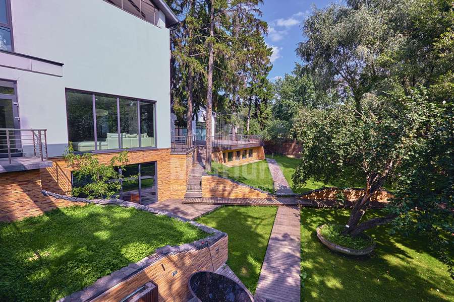 На участке проведены ландшафтные работы, растут ели, сосны, дубы и яблони. протекает ручей. Дом полностью меблирован новой дизайнерской мебелью и светильниками.