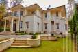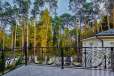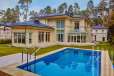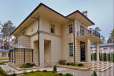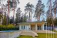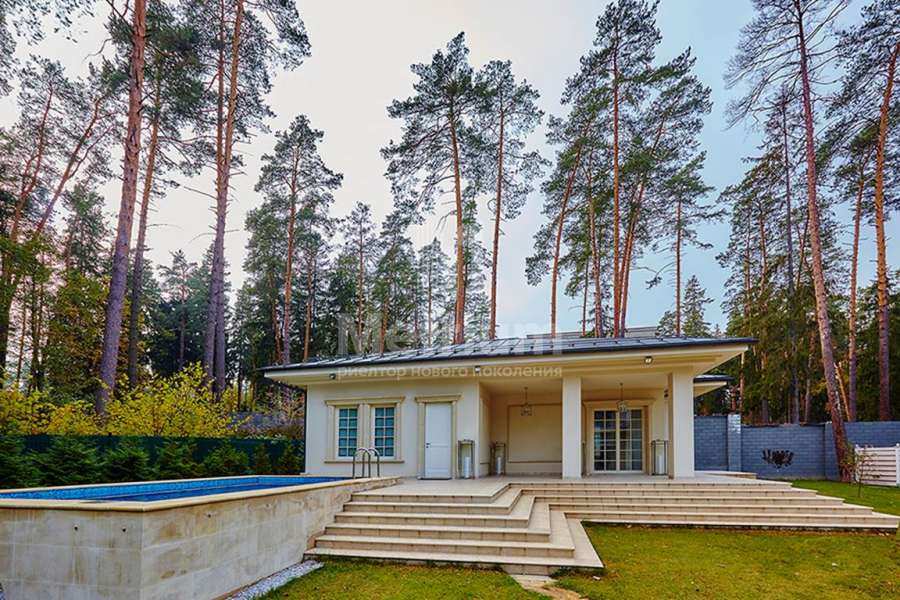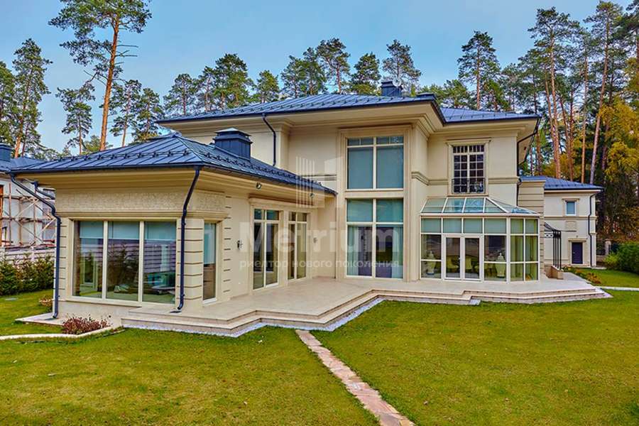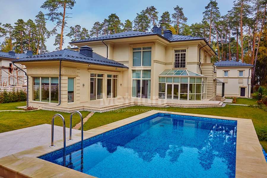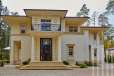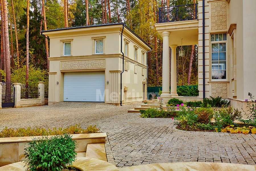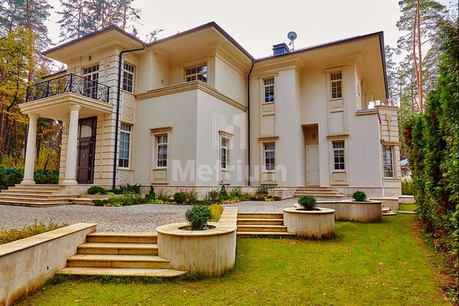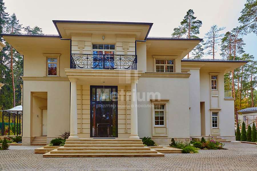 Загородный дом площадью 860 м² расположена на лесном участке 25 соток. Светлый фасад выполнен в неоклассическом стиле, облицован штукатуркой и декорирован колоннами, рустовкой и коваными элементами. Современный
