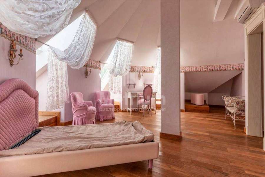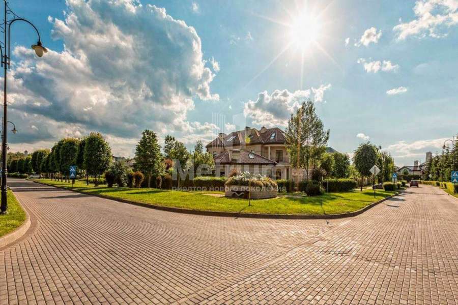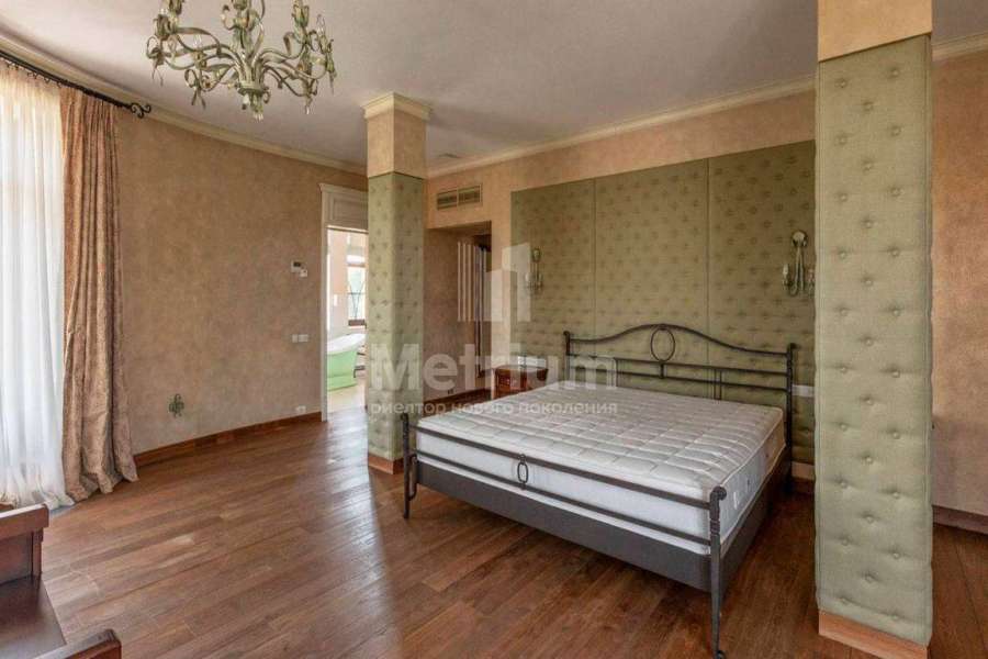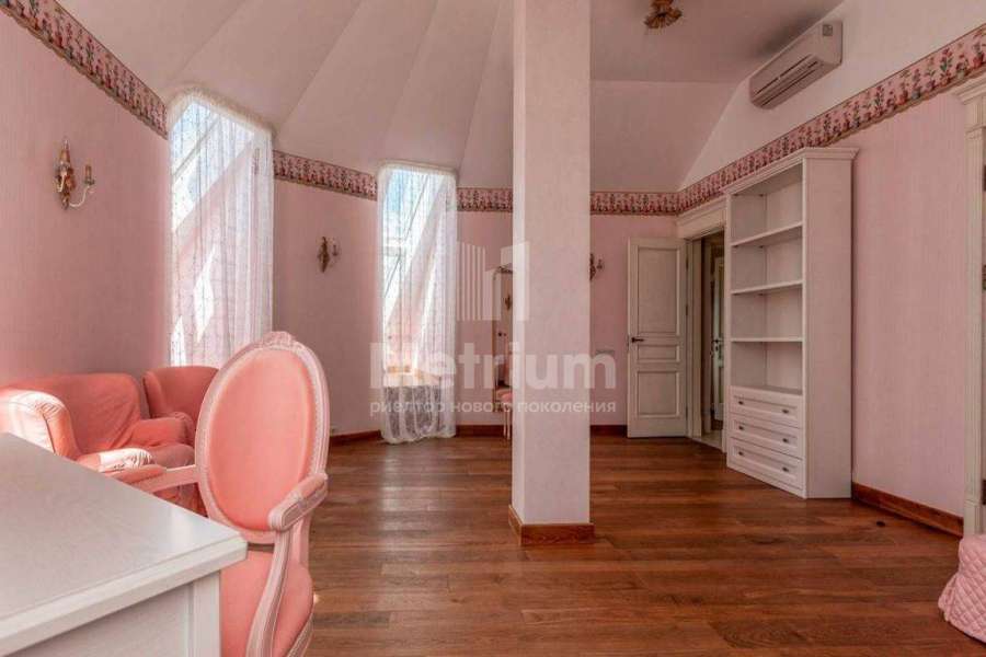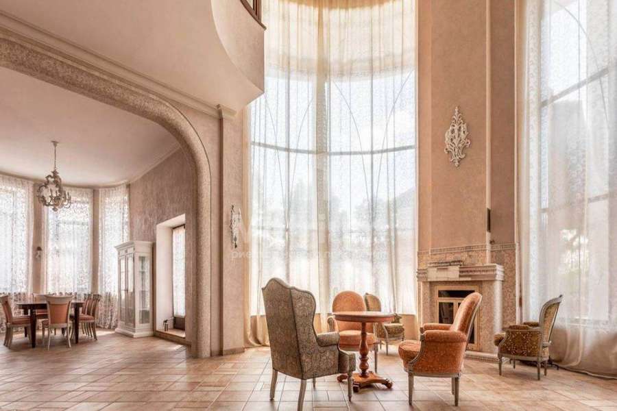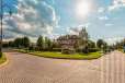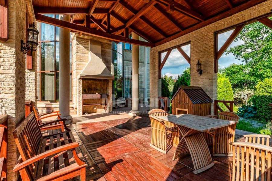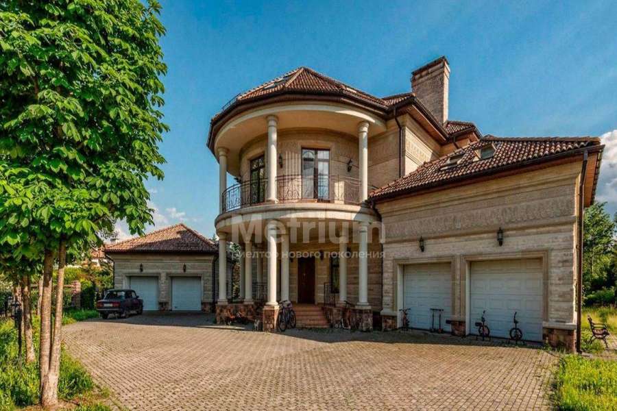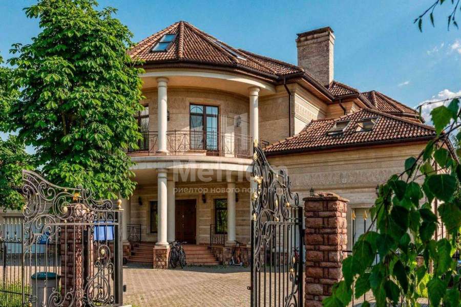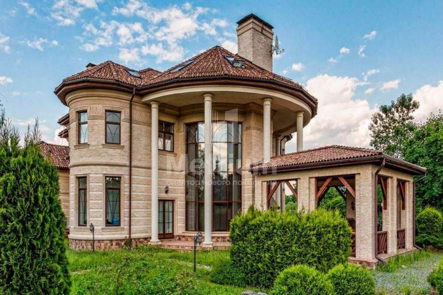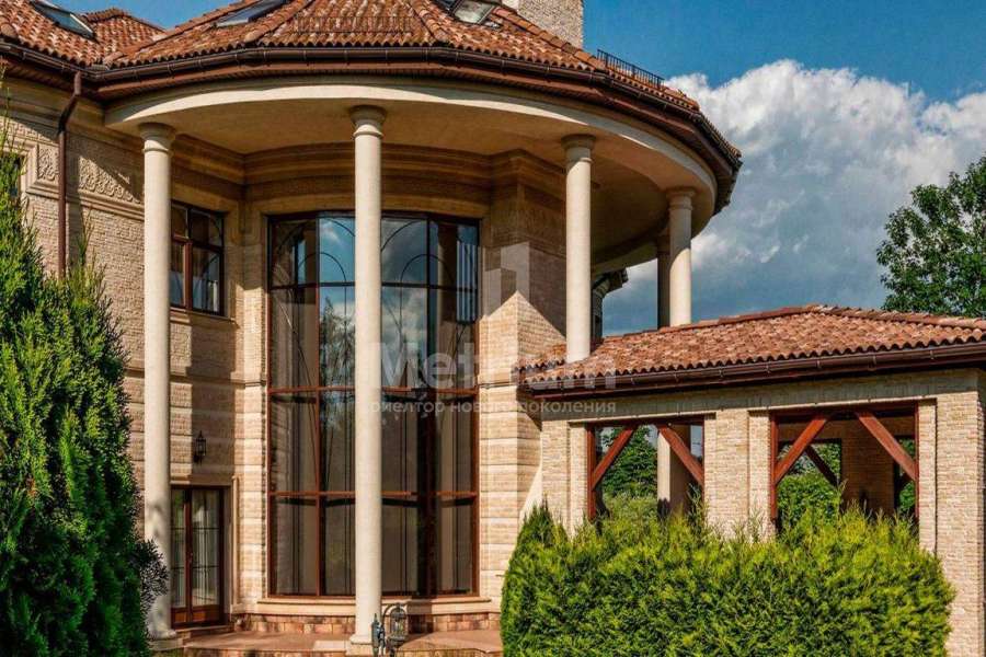 Загородный дом площадью 700 м² расположен на полевом участке 23,1 сот. Фасад в европейском стиле облицован натуральным камнем, декорирован колоннами и орнаментами. Интерьер оформлен в светлых теплых оттенках, создающих атмосферу уюта. В коттедже спланировали 7 спален, гостиную с камином, кухню-столовую, комнату отдыха, кабинет с бильярдной и эркером, комнату для няни. Предусмотрены 2 гаража на 2 машины каждый и квартира для персонала 50 м². На участке выполнен ландшафтный дизайн, обустроен двухъярусный сад, оборудовано уличное освещение.