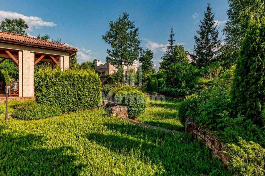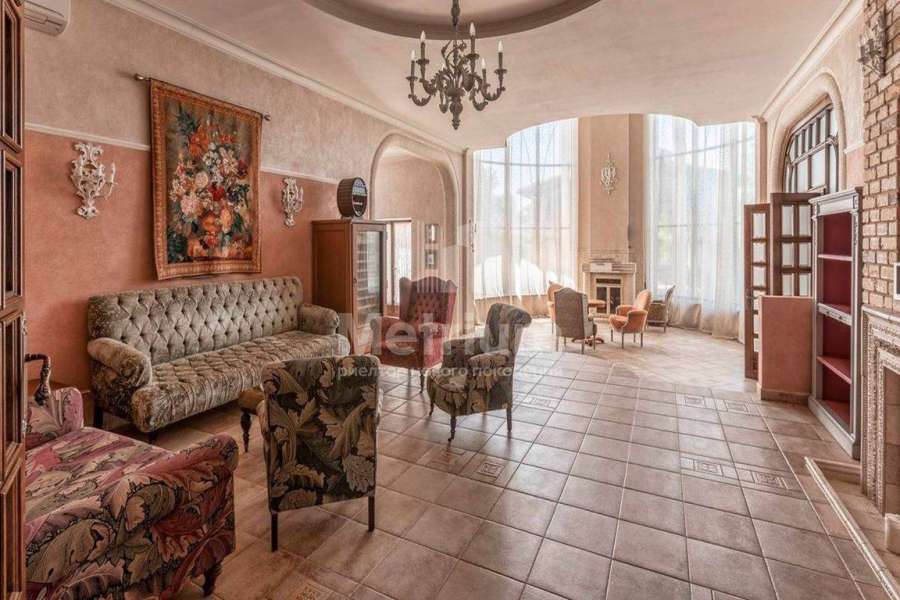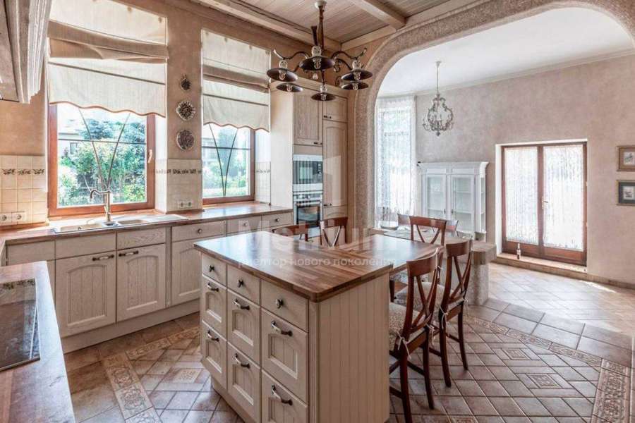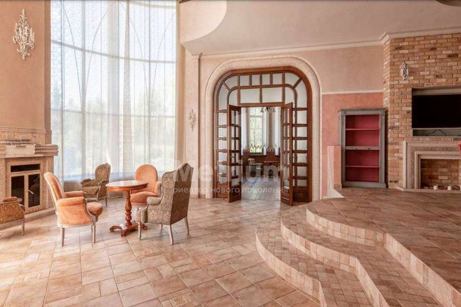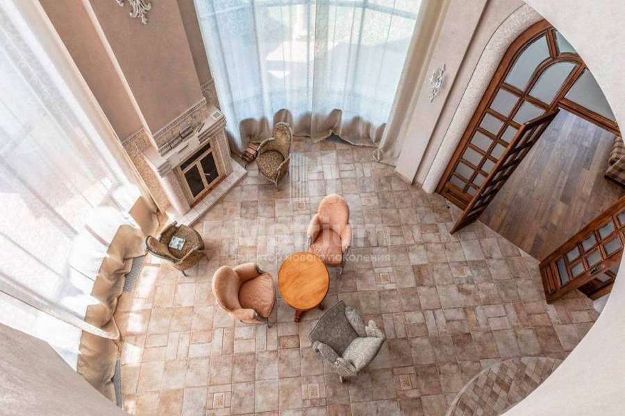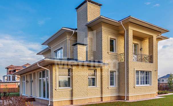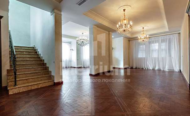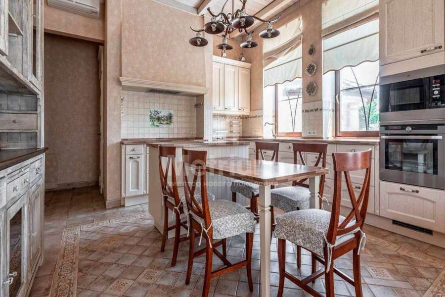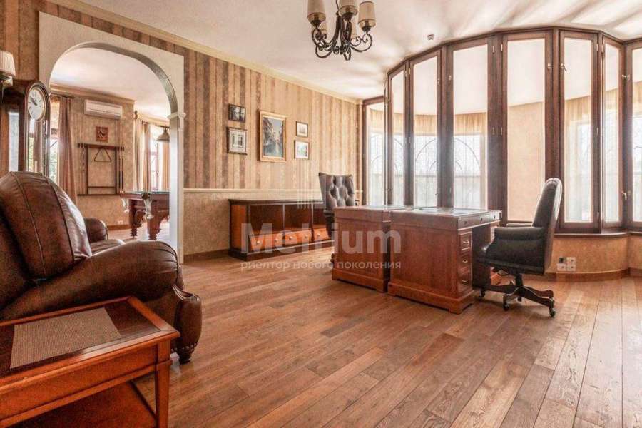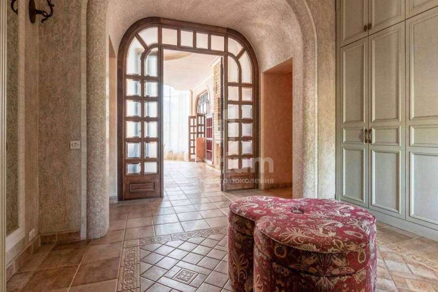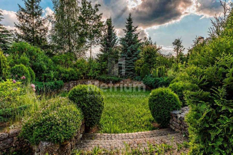 Загородный дом площадью 700 м² расположен на полевом участке 23,1 сот. Фасад в европейском стиле облицован натуральным камнем, декорирован колоннами и орнаментами. Интерьер оформлен в светлых теплых оттенках, создающих атмосферу уюта. В коттедже спланировали 7 спален, гостиную с камином, кухню-столовую, комнату отдыха, кабинет с бильярдной и эркером, комнату для няни. Предусмотрены 2 гаража на 2 машины каждый и квартира для персонала 50 м². На участке выполнен ландшафтный дизайн, обустроен двухъярусный сад, оборудовано уличное освещение.