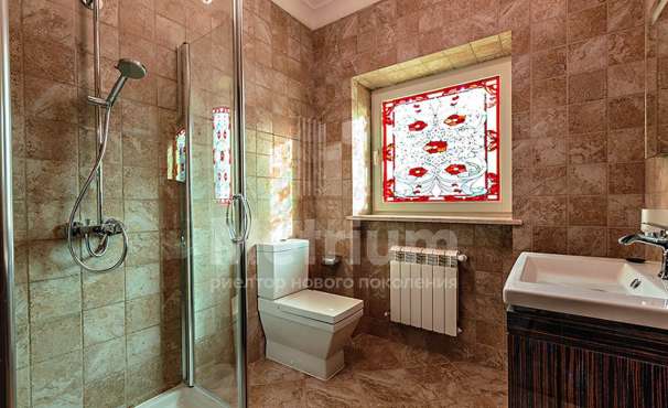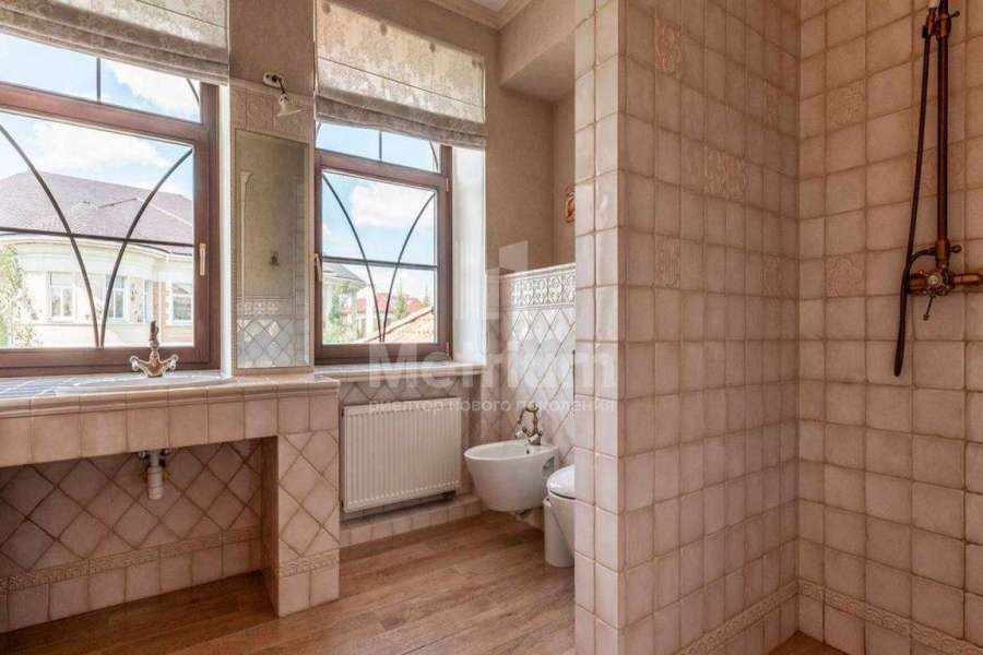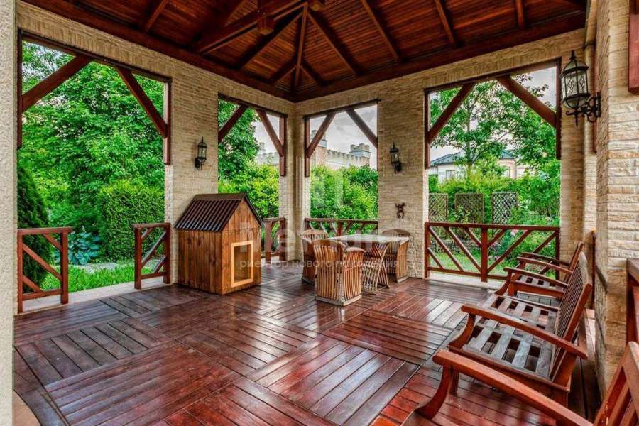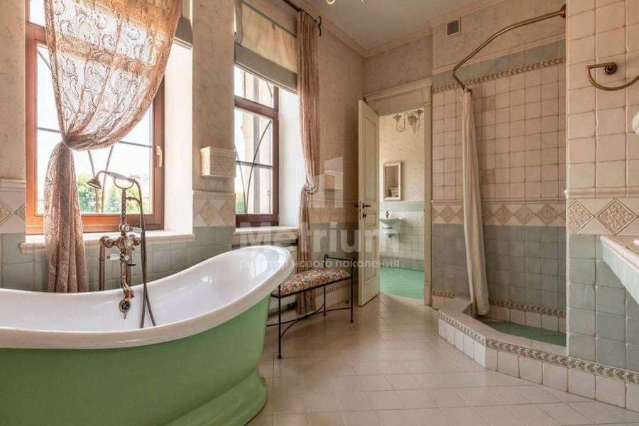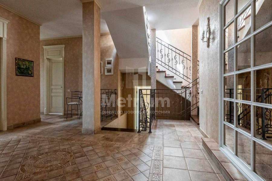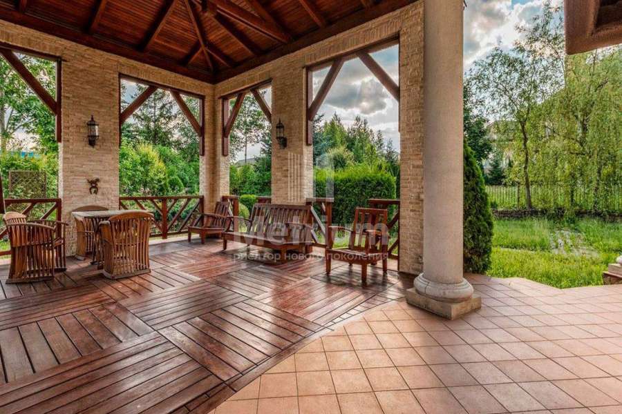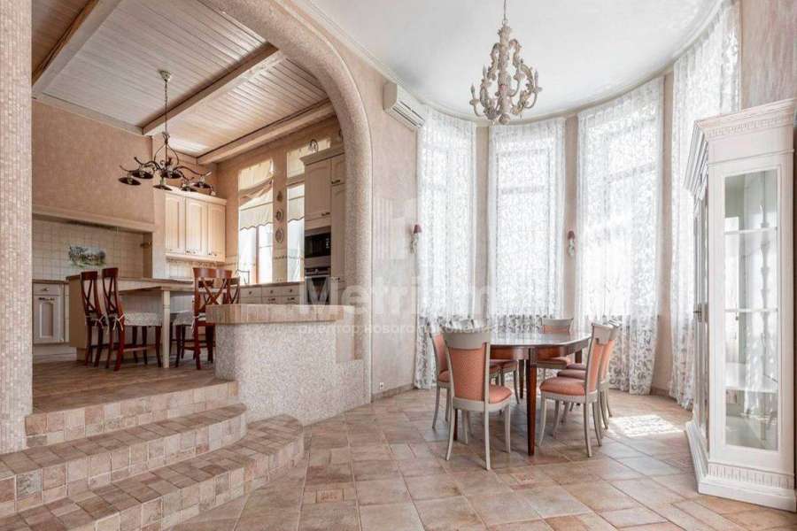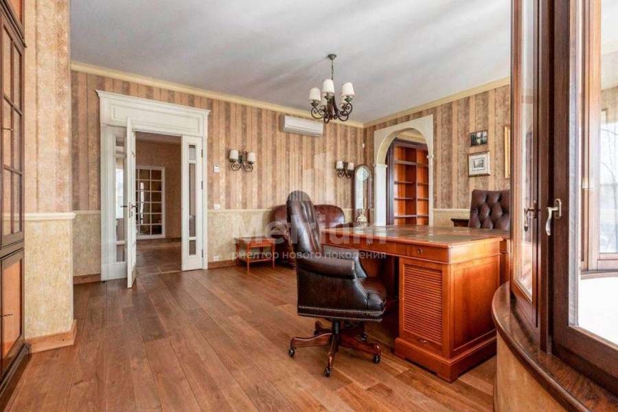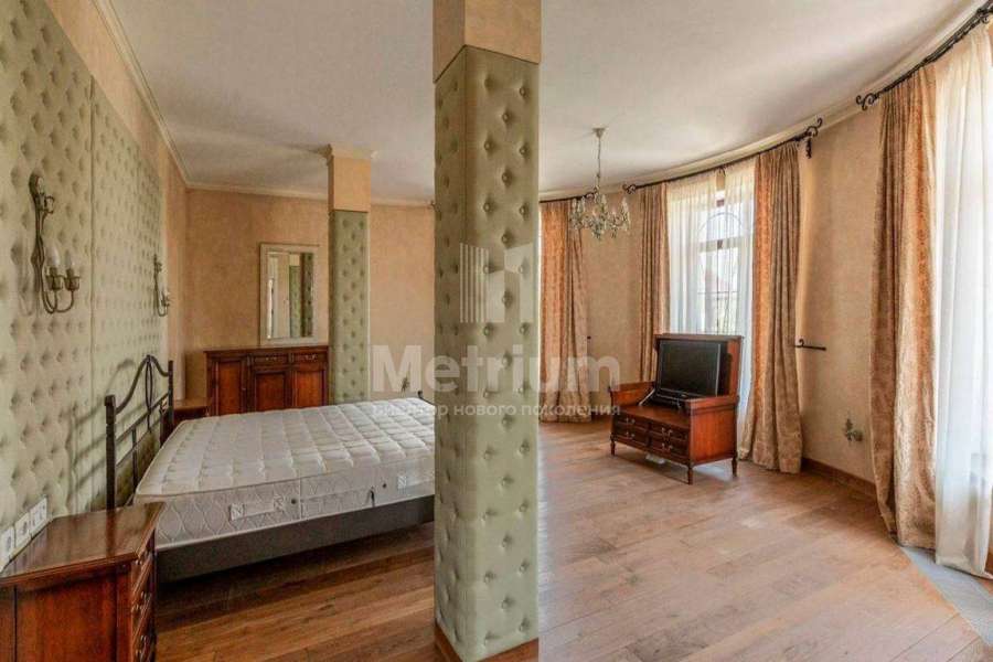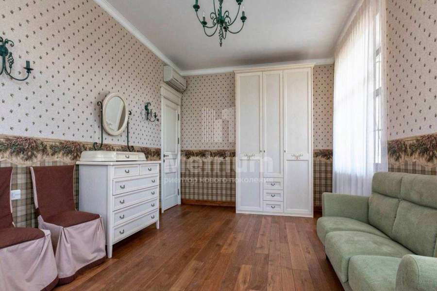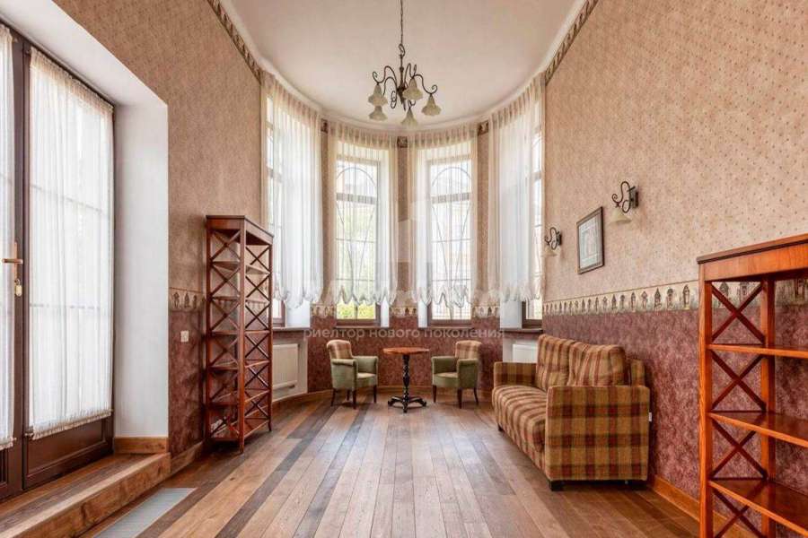 Загородный дом площадью 700 м² расположен на полевом участке 23,1 сот. Фасад в европейском стиле облицован натуральным камнем, декорирован колоннами и орнаментами. Интерьер оформлен в светлых теплых оттенках, создающих атмосферу уюта. В коттедже спланировали 7 спален, гостиную с камином, кухню-столовую, комнату отдыха, кабинет с бильярдной и эркером, комнату для няни. Предусмотрены 2 гаража на 2 машины каждый и квартира для персонала 50 м². На участке выполнен ландшафтный дизайн, обустроен двухъярусный сад, оборудовано уличное освещение.