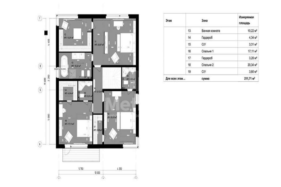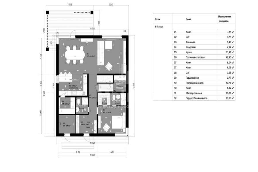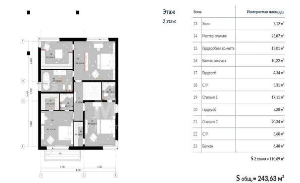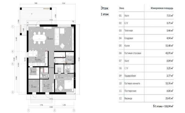 | Этажи/уровни: | На первом этаже просторная кухня-столовая-гостиная с выходом на террасу, хозяйственные помещения и гостевая спальням. На втором — 3 спальни с санузлами и гардеробными. |