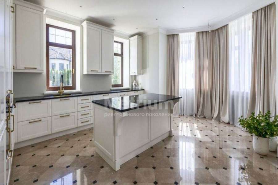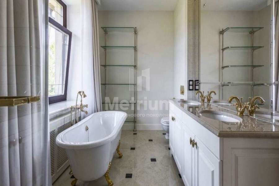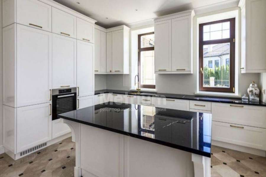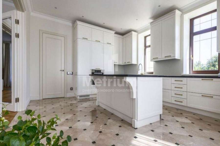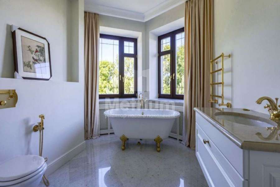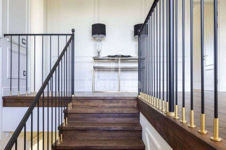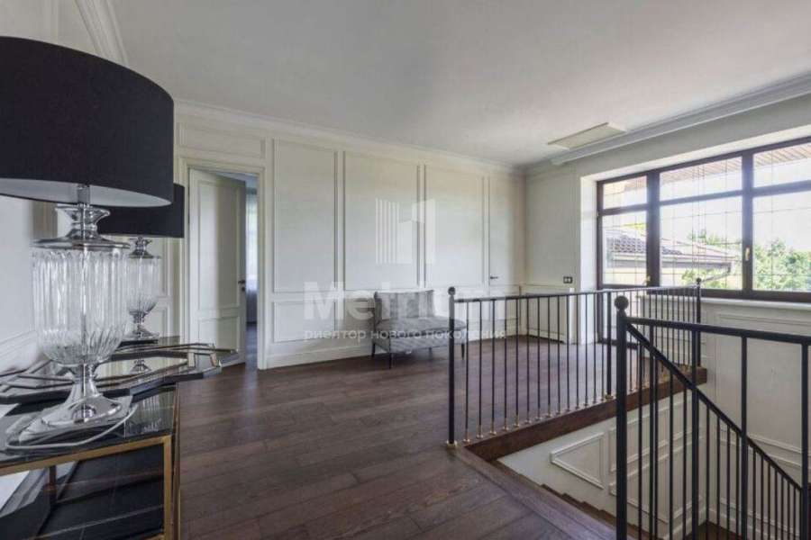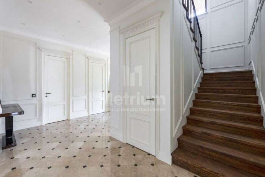 Дом находится в коттеджном посёлке Гринфилд в Истринском районе в 29 километрах км от МКАД по скоростному Новорижскому шоссе. Классический молочный оттенок стен и идеальный паркет плавно перетекают из комнаты в комнату, создавая ощущение единства и широкий простор для фантазии. Тёплую атмосферу дополняют деревянная лестница, оконные рамы, золотистая фурнитура и плитка песочных тонов.