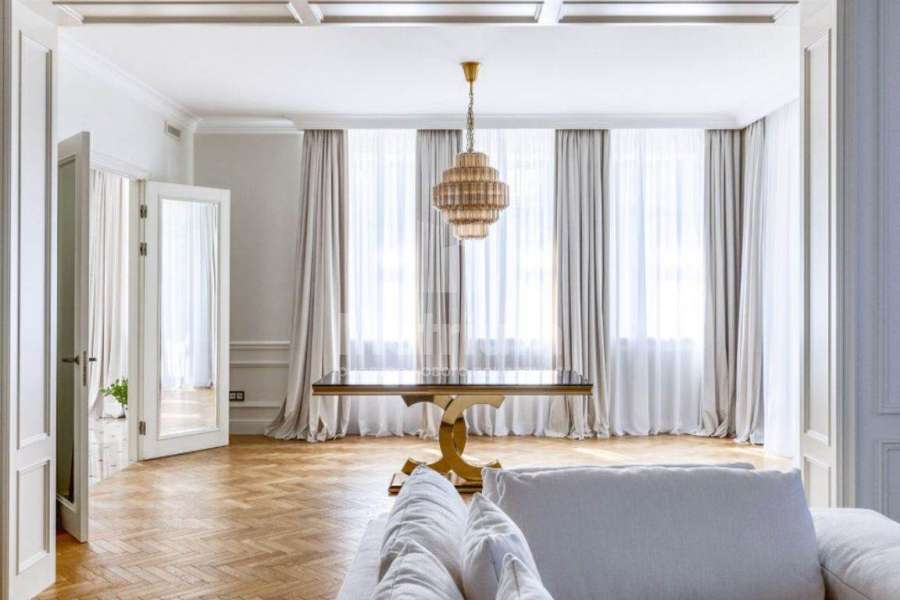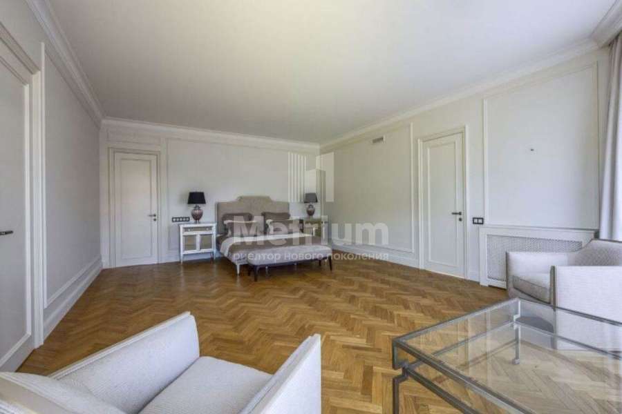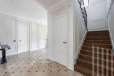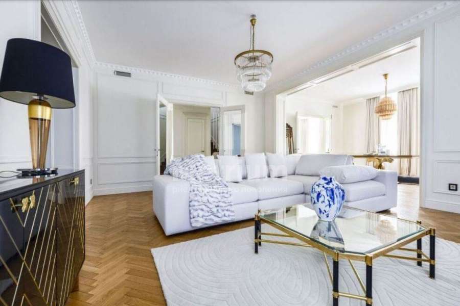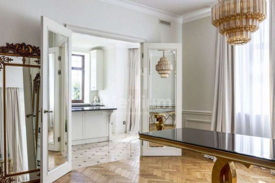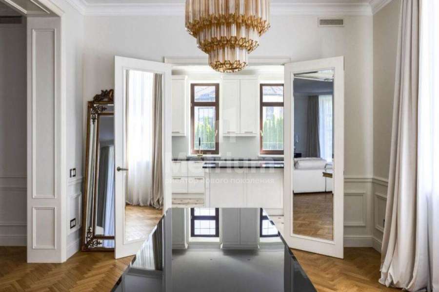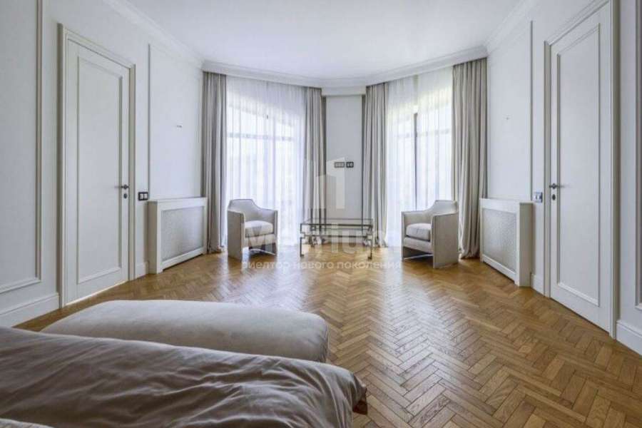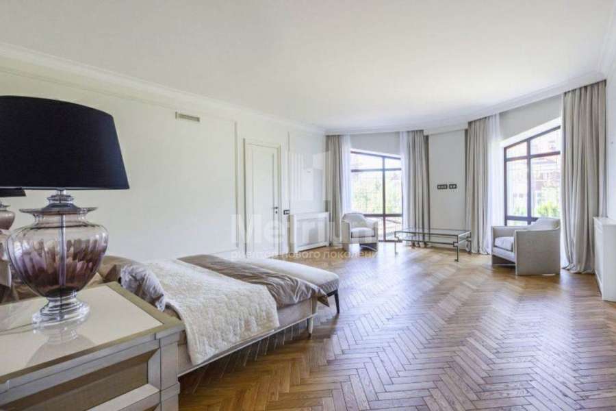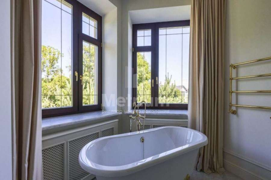 Дом находится в коттеджном посёлке Гринфилд в Истринском районе в 29 километрах км от МКАД по скоростному Новорижскому шоссе. Классический молочный оттенок стен и идеальный паркет плавно перетекают из комнаты в комнату, создавая ощущение единства и широкий простор для фантазии. Тёплую атмосферу дополняют деревянная лестница, оконные рамы, золотистая фурнитура и плитка песочных тонов.