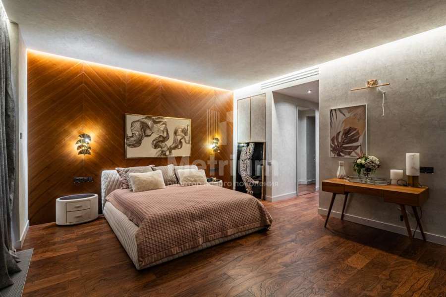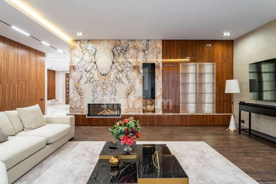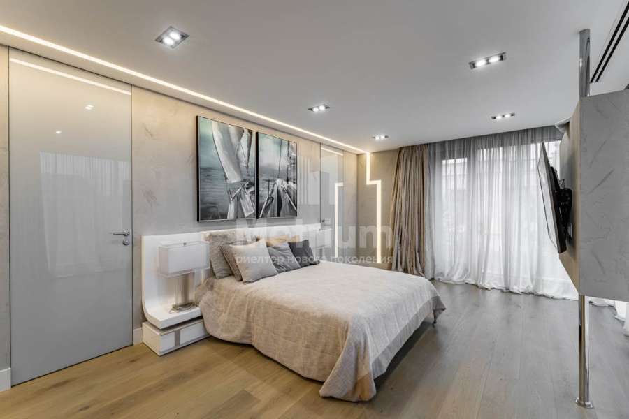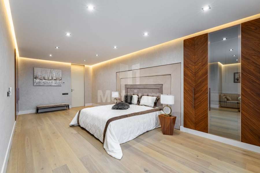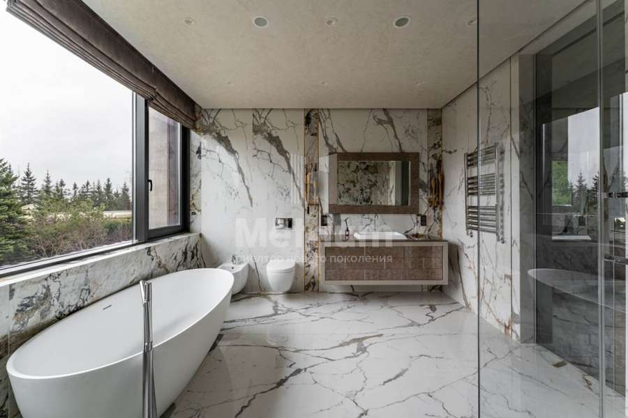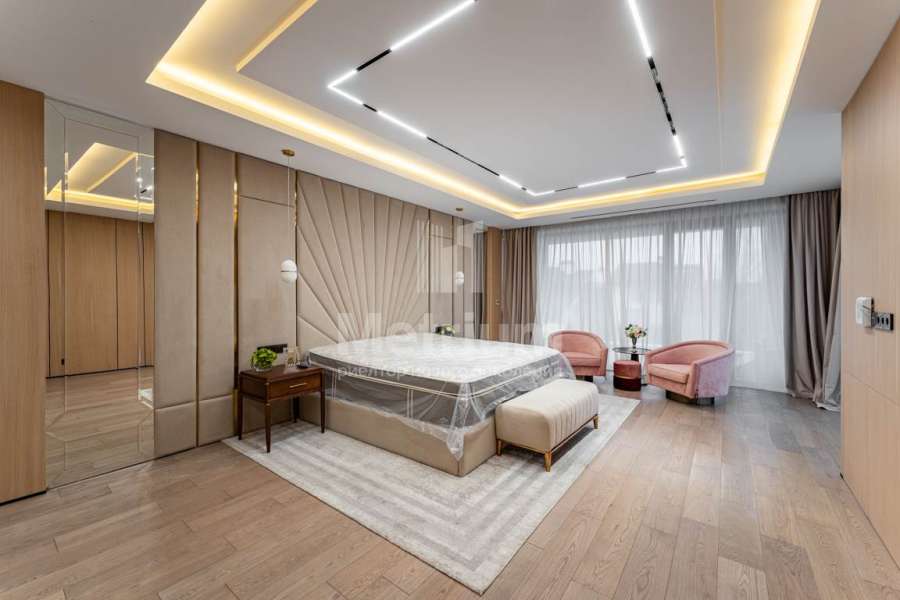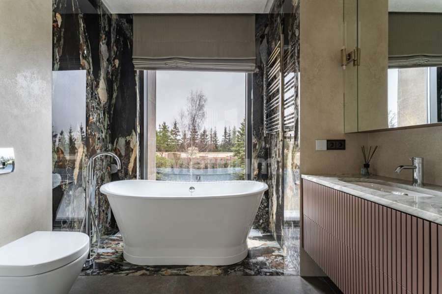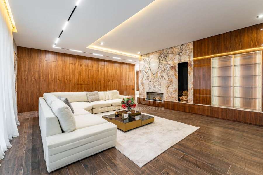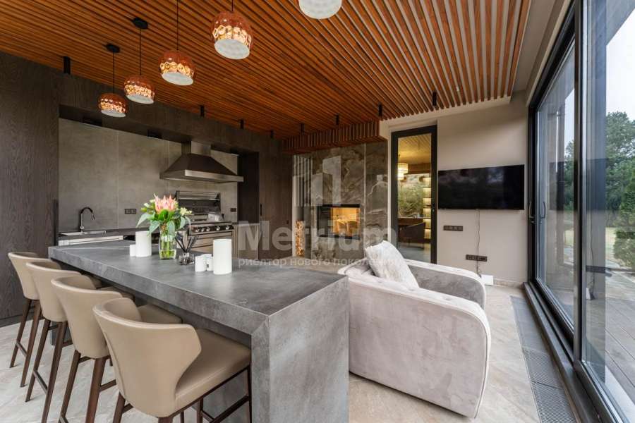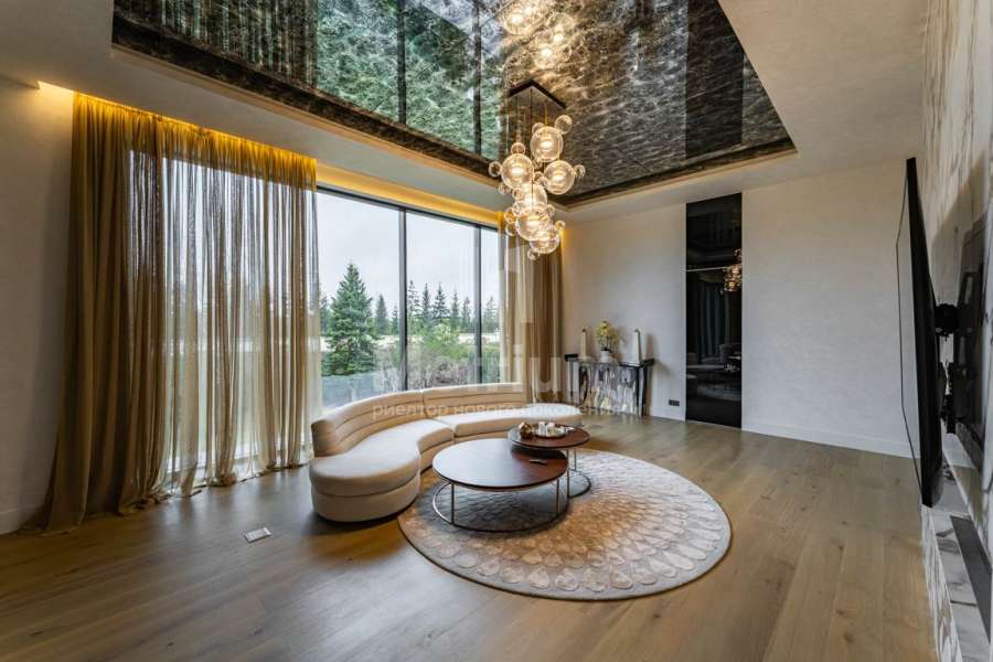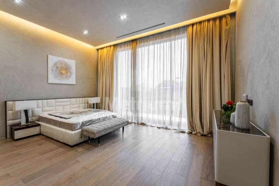 Дизайн выполнен в роскошных светлых теплых оттенках в совокупности с интересными дизайнерскими решениями. В доме 5 спален со своими с/у и гардеробными, роскошная зона барбекю с камином и прекрасным видом на участок. Уютная столовая соединена с зоной барбекю двухсторонним камином, новая итальянская кухня оснащена техникой Miele, просторная гостиная с окнами в пол и камином из оникса, полностью оборудованная гардеробная при входе, квартира для персонала с отдельным входом. Гараж на 4 машиноместа. Выполнен ландшафтный дизайн с освещением и дорожками, при отделке использовались самые современные и дорогие материалы, особое внимание уделено освещению и подсветке.