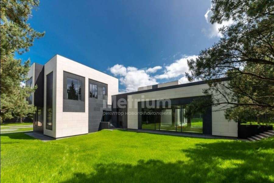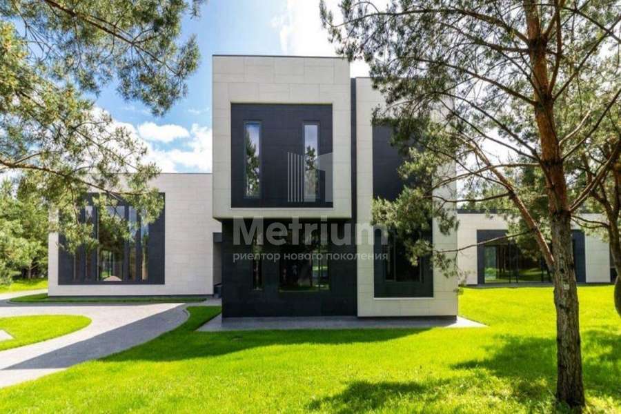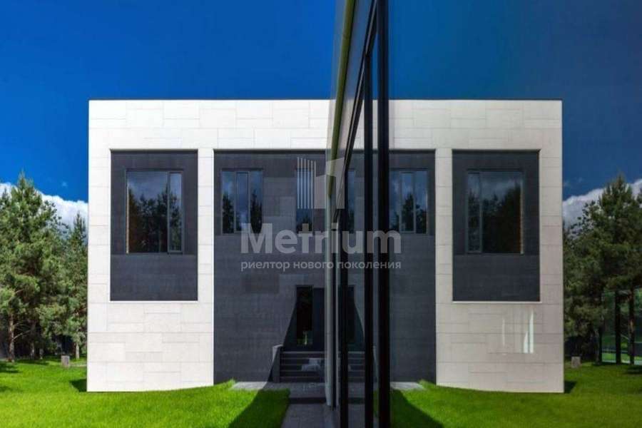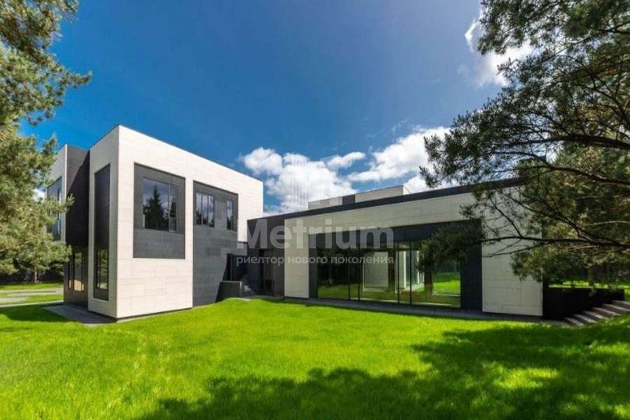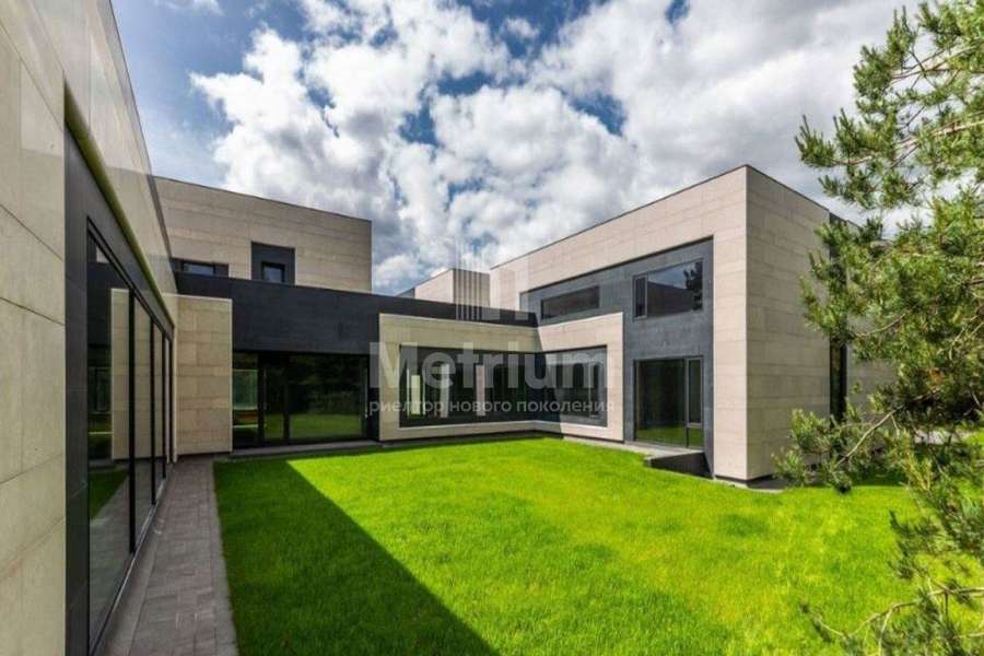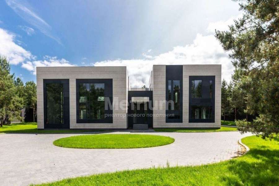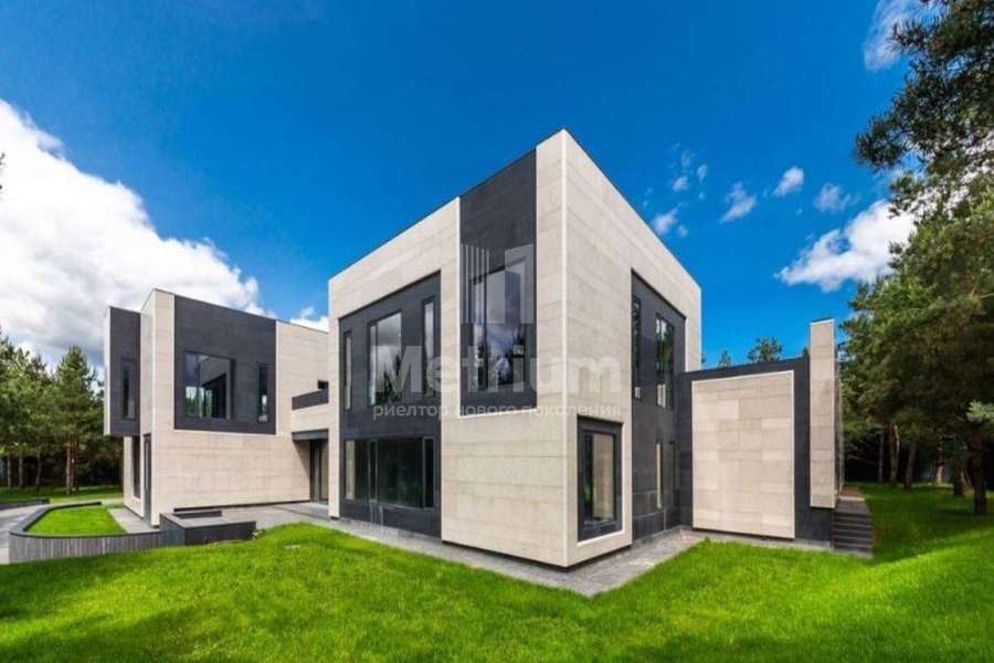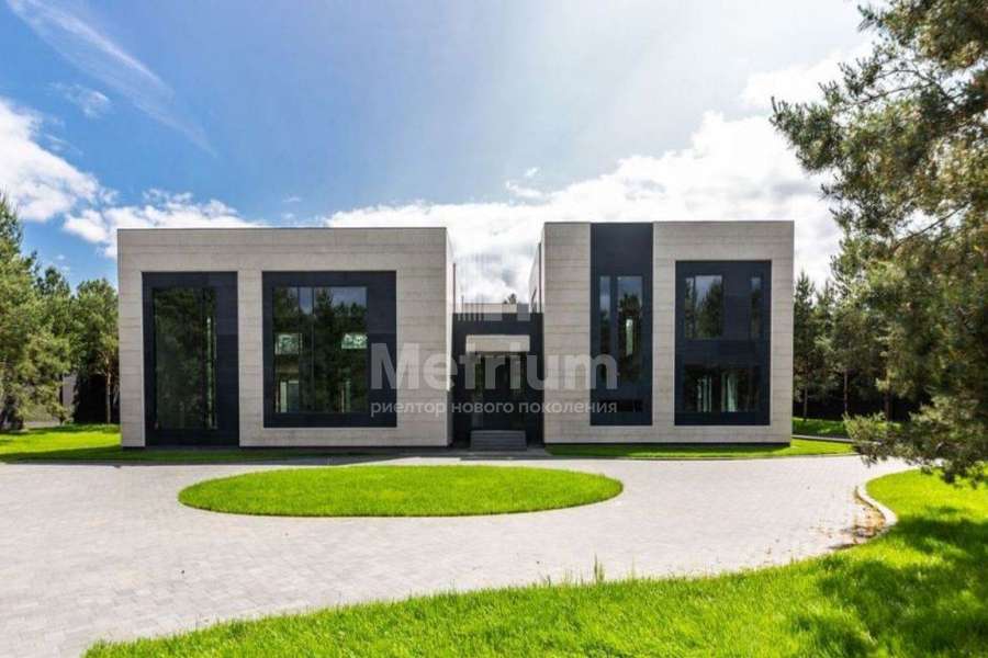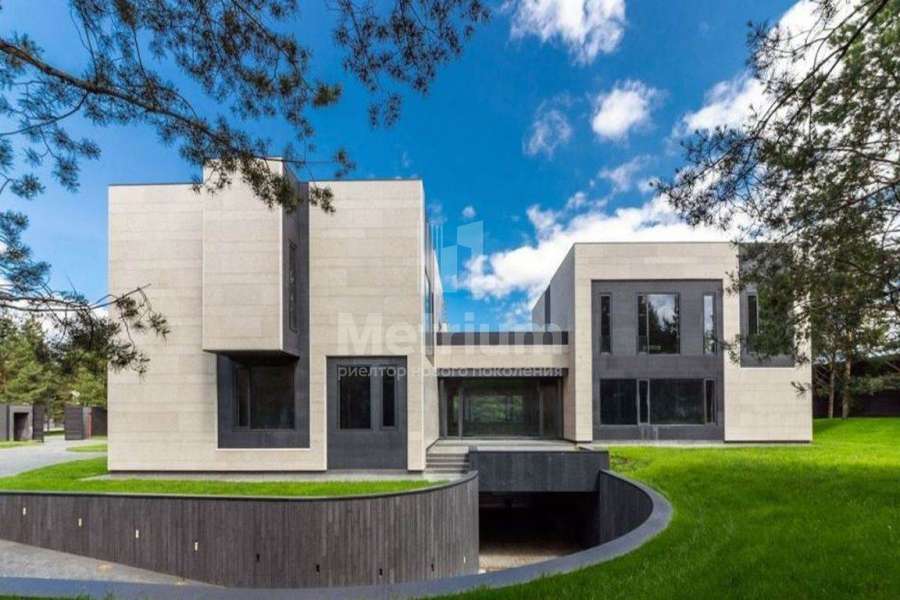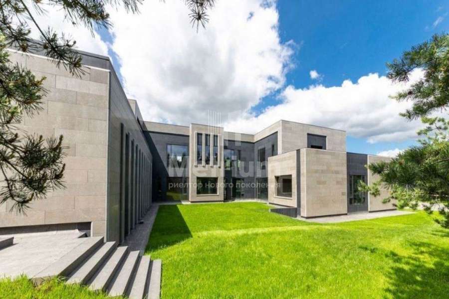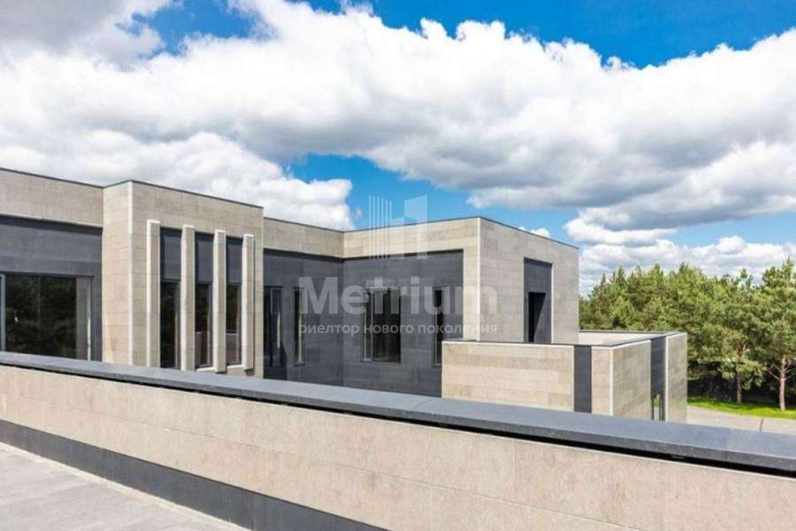 Дом 2240,8 кв.м на участке 39,9 сотки в охраняемом коттеджном поселке. Высокие потолки (7,5 м). Фасад дома отделан натуральным камнем. Предусмотрен пассажирский и продуктовый лифты, система климат-контроля и слаботочные сервисные системы. В настоящее время ведутся отделочные работы технических помещений, монтируются внутренние инженерные системы. Из нескольких помещений есть выходы на эксплуатируемую кровлю. Организован выход на эксплуатируемую кровлю стилобатной части (первого этажа), которая оборудуется зенитными фонарями в зоне бассейна и холла. Отдельно на территории построены таунхаусы с квартирами для персонала, гаражом на 2 м/м и отдельное здание с мойкой для автомобилей. Подогреваемые пандусы, низкорадиусный бордюр. На территории высажены сосны, ели, туи и другие крупномеры. Дороги вымощены камнем, установлено освещение.