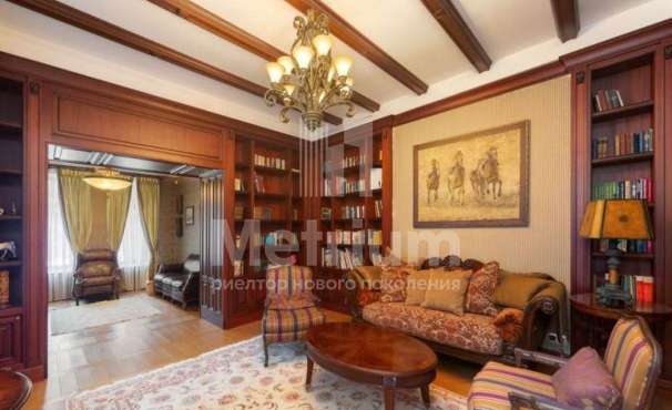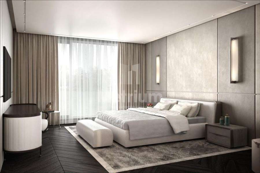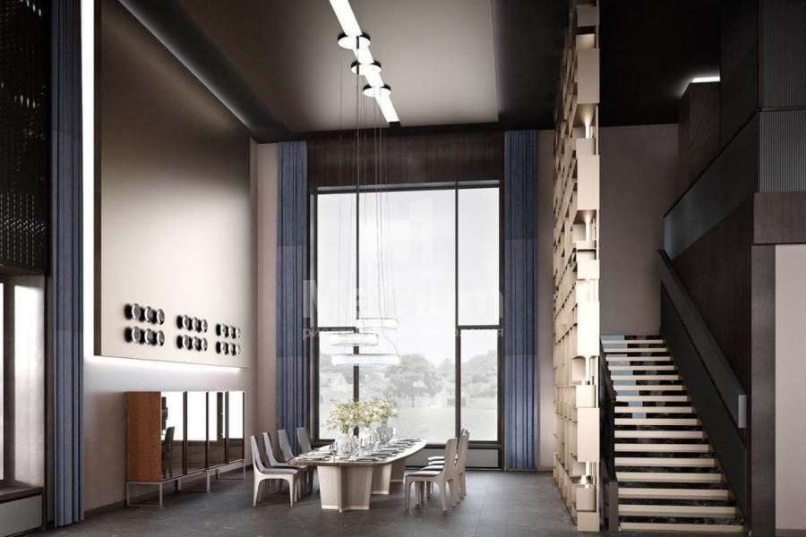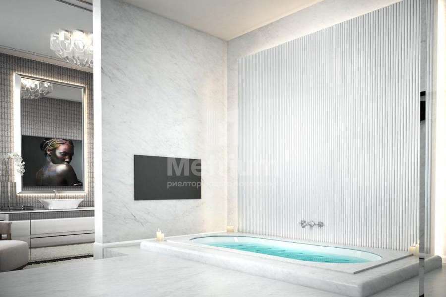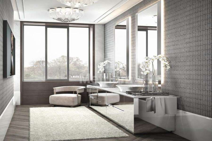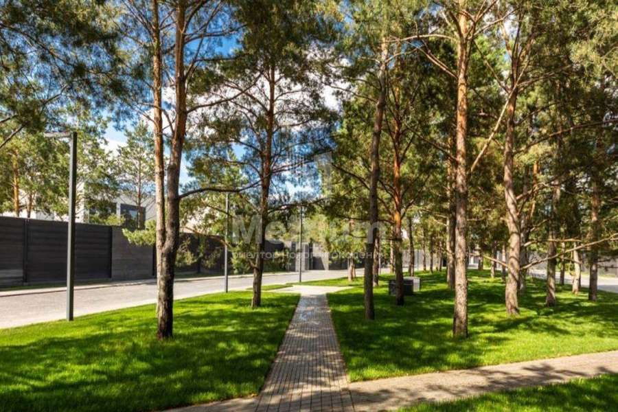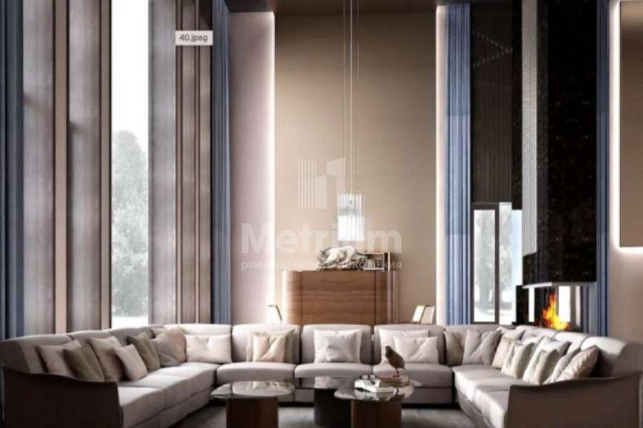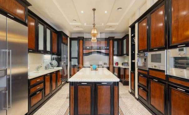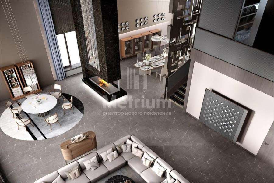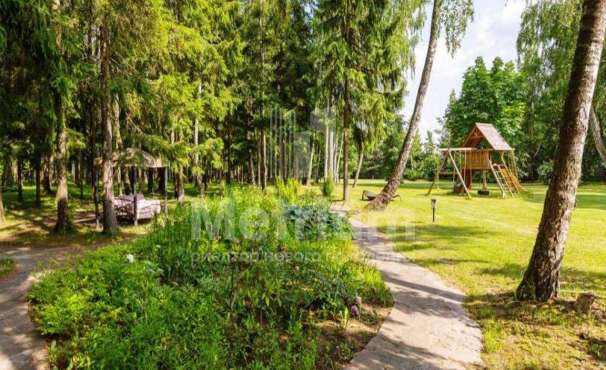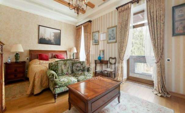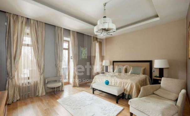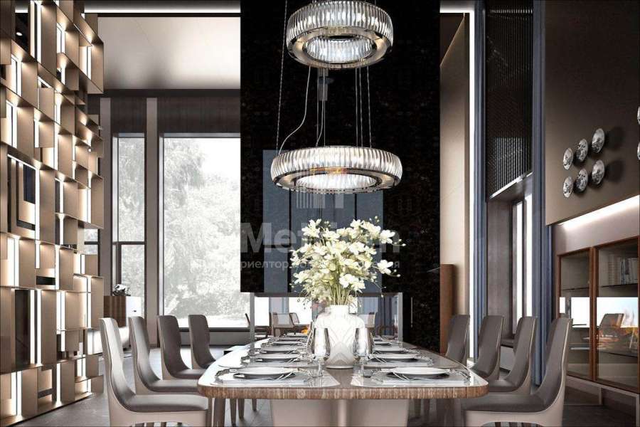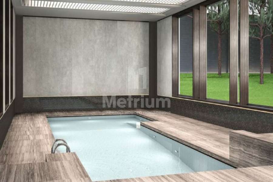 Дом 2240,8 кв.м на участке 39,9 сотки в охраняемом коттеджном поселке. Высокие потолки (7,5 м). Фасад дома отделан натуральным камнем. Предусмотрен пассажирский и продуктовый лифты, система климат-контроля и слаботочные сервисные системы. В настоящее время ведутся отделочные работы технических помещений, монтируются внутренние инженерные системы. Из нескольких помещений есть выходы на эксплуатируемую кровлю. Организован выход на эксплуатируемую кровлю стилобатной части (первого этажа), которая оборудуется зенитными фонарями в зоне бассейна и холла. Отдельно на территории построены таунхаусы с квартирами для персонала, гаражом на 2 м/м и отдельное здание с мойкой для автомобилей. Подогреваемые пандусы, низкорадиусный бордюр. На территории высажены сосны, ели, туи и другие крупномеры. Дороги вымощены камнем, установлено освещение.