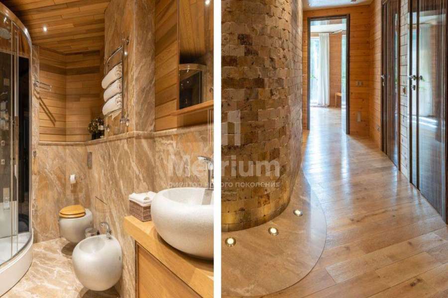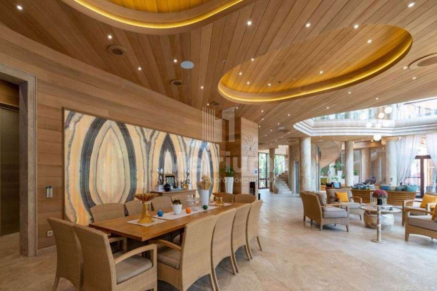 Дом в КП Успенский лес. Проект объединен с природным массивом при помощи использования в отделке фасадов гонта из канадского кедра, а так же главные фасады особняка имеют сплошное остекление в полную высоту этажей и обращены в хвойную чащу. В доме: 30 помещений, 30 с/у, 7 спален, 2 просторные гостиные с кинотеатрами, спортзал, спа в балийском стиле с сауной, хамамом, соленой комнатой, бассейн, боулинг , 2 кухни, лифт, кинотеатр, сигарная комната и библиотека , холодильная и чемоданная комната, гараж на 10 м/м, гостевой дом, дом для персонала, террасы с мягкой мебелью, кинотеатром, круглогодичным джакузи, шезлонгами, гольфом (патинг).