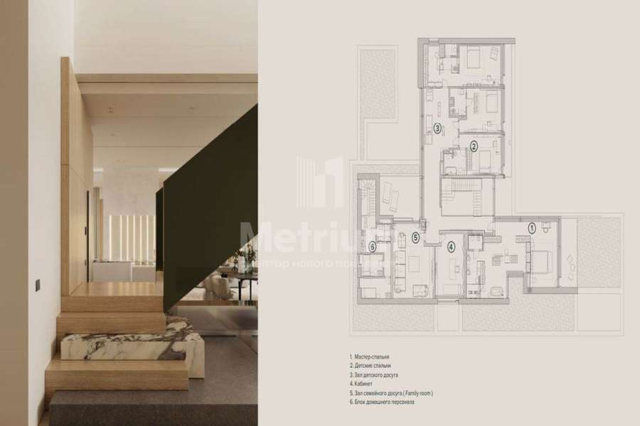 | Этажи/уровни: | 1 этаж: просторная кухня-гостиная (123 кв.м.), гостевая комната, три санузла и СПА-зона с раздевалкой, массажной комнатой и баней, продолжающуюся террасой (48 кв.м.). Технические помещения первого этажа подразумевают отдельный вход для персонала, постирочную, кладовку. 2 этаж: мастер-спальня (81 кв.м.), 3 спальни с санузлами, семейная комната и детская библиотека. В каждой гардеробной предусмотрено окно, а общая площадь террас и балконов второго этажа составляет 50 кв.м.! Технический блок второго этажа состоит из кухни, санузла и двух спален. |