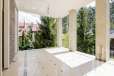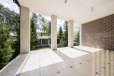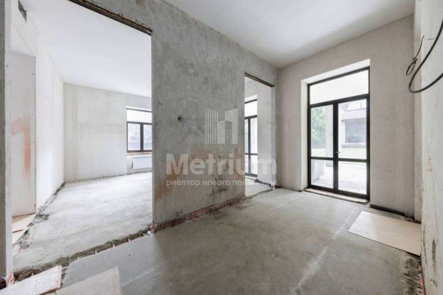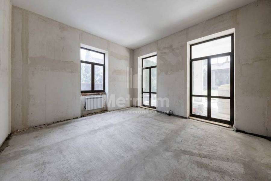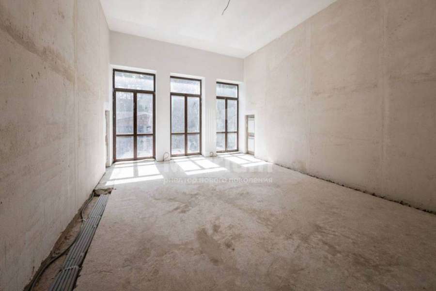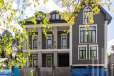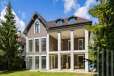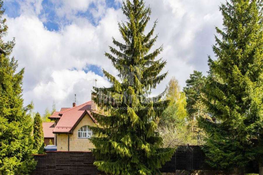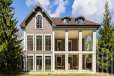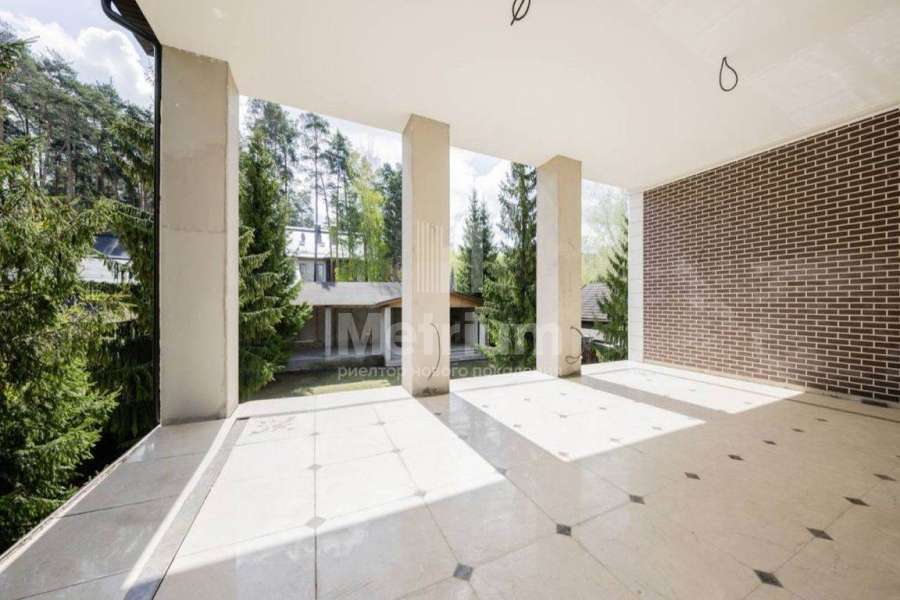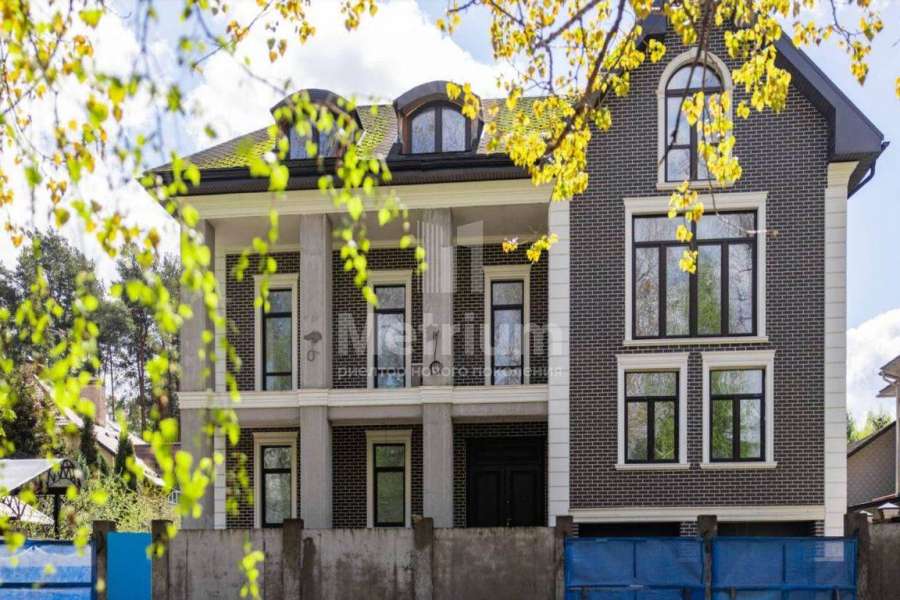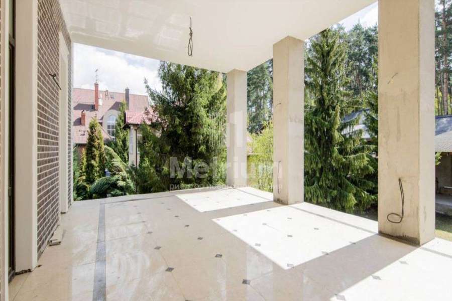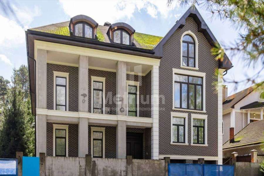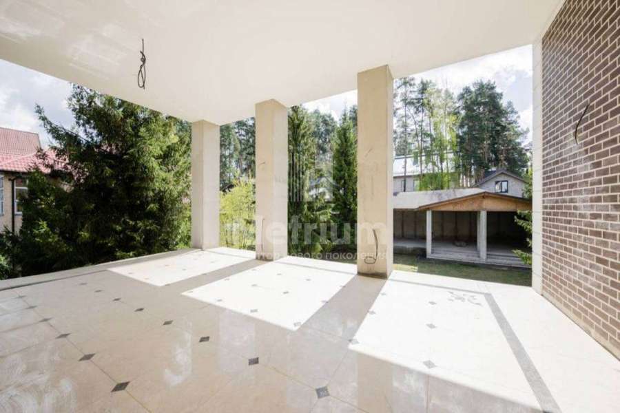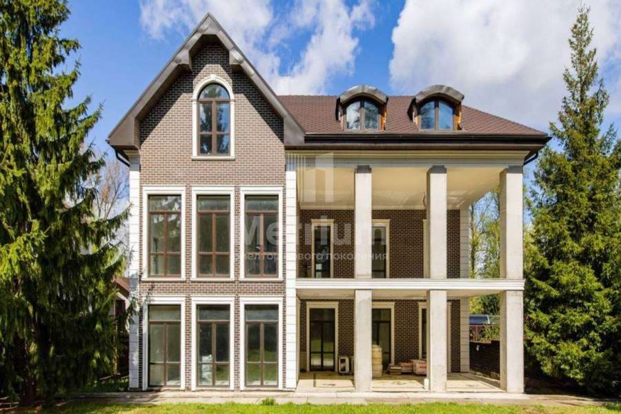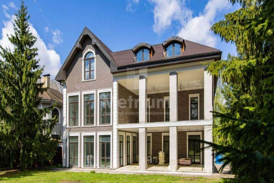 Загородный дом площадью 1300 м² построен на ровном полевом участке 15 соток без ландшафтного дизайна. Фасад в европейском стиле облицован коричневой клинкерной плиткой и натуральным камнем по цоколю, декорирован белыми наличниками и колоннами. В коттедже без отделки спланировали несколько спален, гостиную, кухню, кабинет, кинотеатр, спортзал, парилку и гараж.