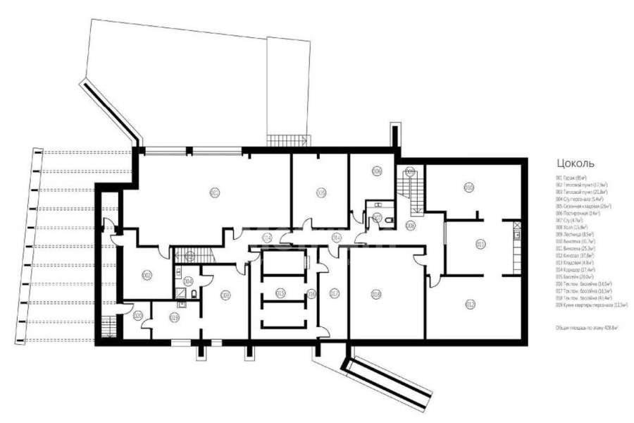 | Этажи/уровни: | Цоколь: холл, кинозал, винотека, санузел, сезонные кладовые, постирочная, гараж на 2 м/м, котельная, оборудование под бассейном, жилой блок для персонала с отдельным входом: прихожая, кухня, комната, санузел. 1 этаж: холл, гардеробная, гостевой санузел, просторная гостиная со вторым светом 84 м², кухнястоловая с кладовой, СПА-зона: комната отдыха, сауна, хамам, душевые, санузел, бассейн (10м), выход на летнюю террасу; спальный блок первого этажа: 3 спальни, каждая с ванной и гардеробной комнатой, выходом на террасу. 2 этаж: холл-библиотека, мастерская/кабинет, выход на эксплуатируемую кровлю, мастер-блок: спальня, будуар, ванная комната, гардеробная, выход на балкон. |