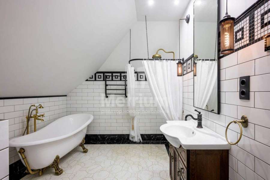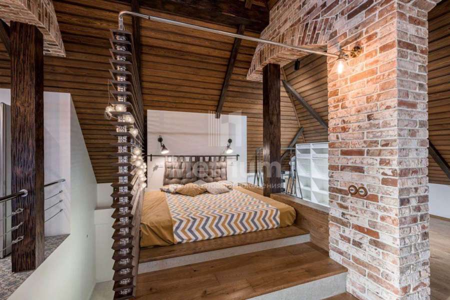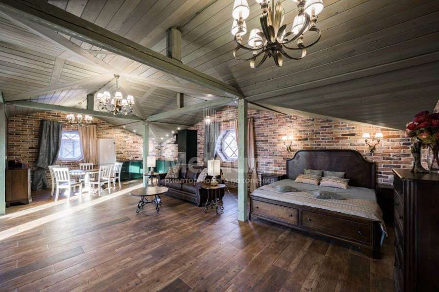 | Этажи/уровни: | 1-й этаж: тамбур (4,7 кв.м), просторный холл (37), гардеробная комната (14,3), кабинет с камином (22,1), кухня-столовая (31,8), гостиная (42,4) с выходом на веранду (31,7) и в сад. В отдельном блоке расположена вторая гостиная с панорамным остеклением (39,2), сауна (4,1), душевая (3,3), гостевой санузел (5,1), котельная (17), кладовая с холодильным и морозильным оборудованием (3,4). 2-й этаж: 3 спальни, в каждой из которых полноценный санузел, две гардеробные, постирочная, просторный холл. Мансарда: стильная студия с собственной кухней и кладовой (121 кв.м), спальня (34,7) и ванная комната (16,2). |
