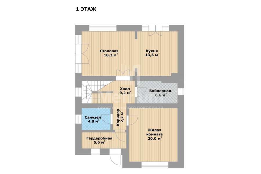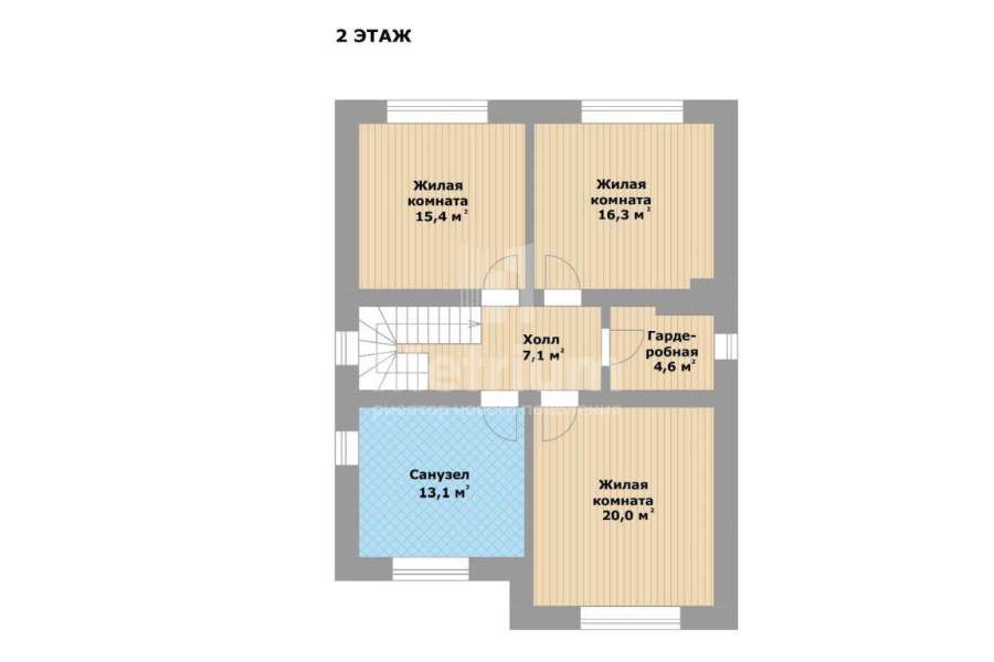 | Этажи/уровни: | 1 этаж: гардеробная (5,6), санузел (4,8), кухня-столовая (32) с выходами на участок, котельная (6,6), спальня (20). 2 этаж: 3 спальни (20, 15,4 и 16,3), просторная ванная комната (13,1), гардеробная (4,6), холл (7,1). |