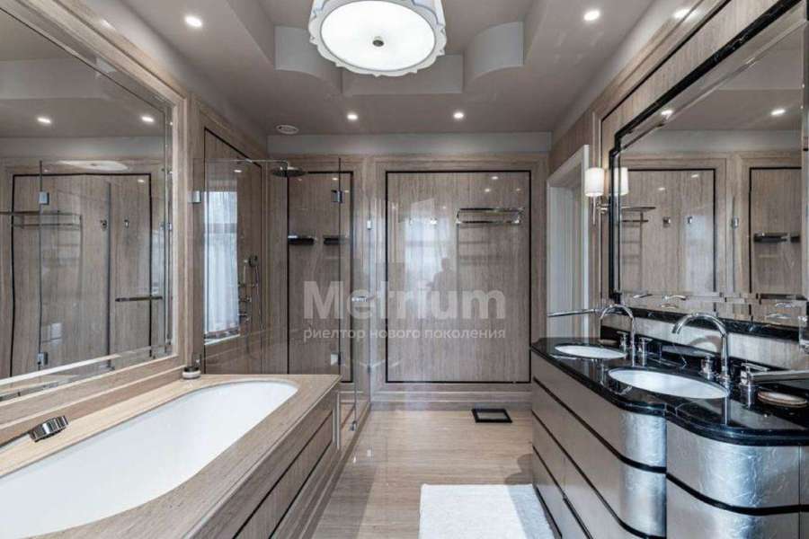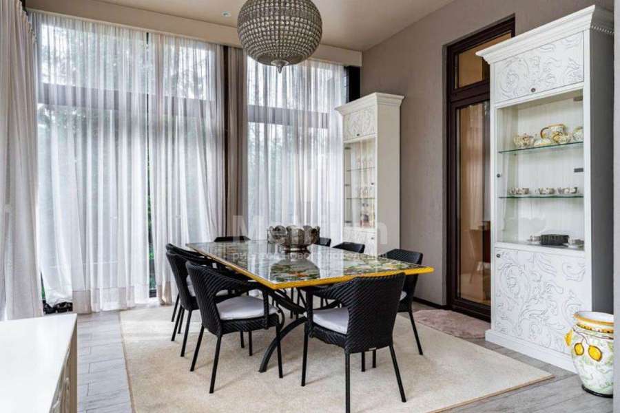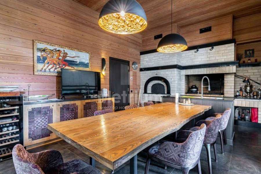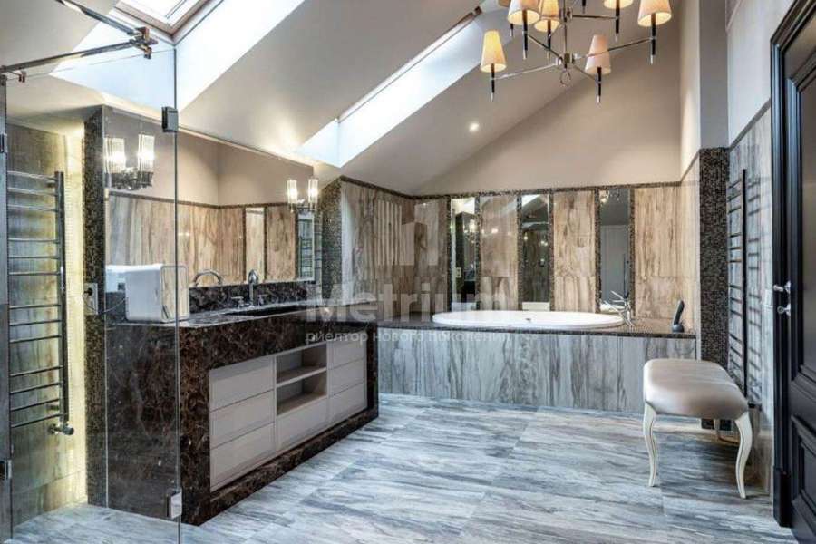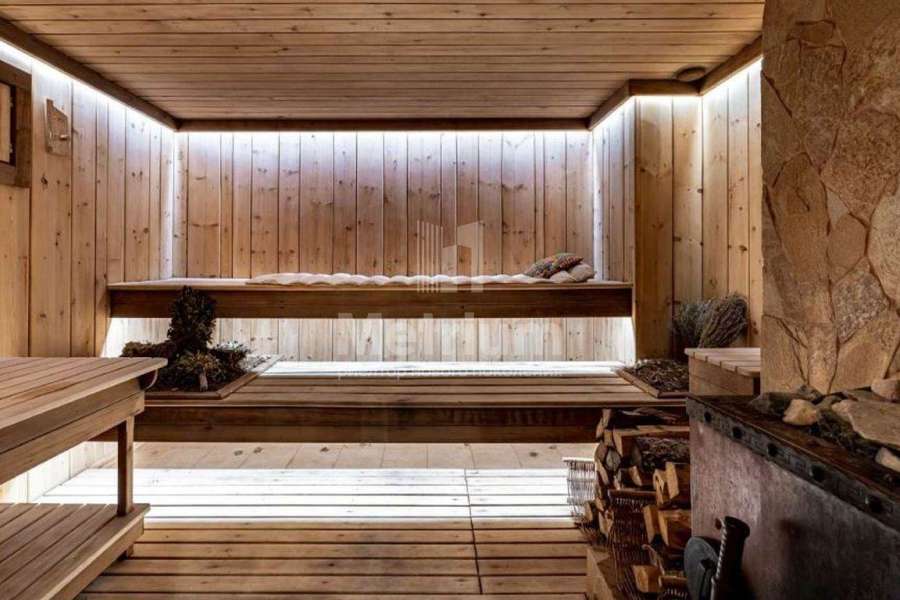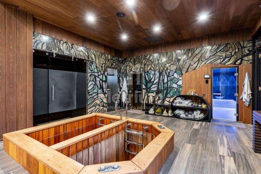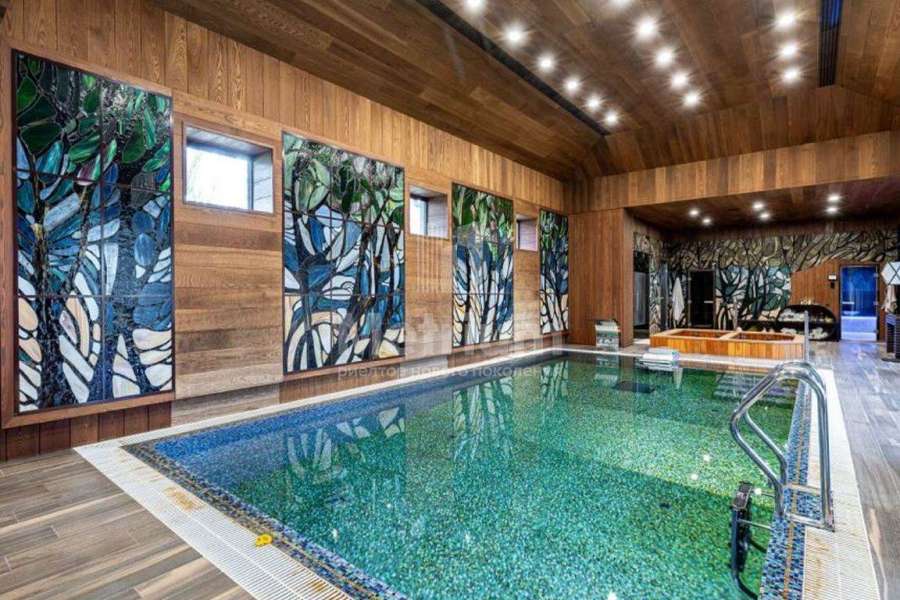 Дом с бассейном под ключ, полностью меблирован. Дом имеет удачное расположение в коттеджном посёлке, так как в пешей доступности находится зелёная парковая зона. Конструктив дома представляет собой монолитный фундамент и перекрытия, стены выполнены из кирпича, кровля - из меди. В отделке использованы современные, дорогостоящие материалы. СПА зона: Расположена в отдельно стоящем здании, которая соединена с основным домом подземным проходом. Планировка: бассейн 9х4 метра, русская баня на дровах, хаммам, две купели, раздевалка с душевой, комната отдыха с камином, помещение под барбекю, большая терраса на улице. Все коммуникации центральные,