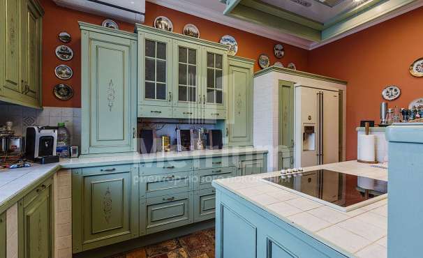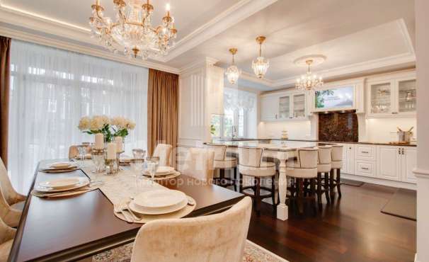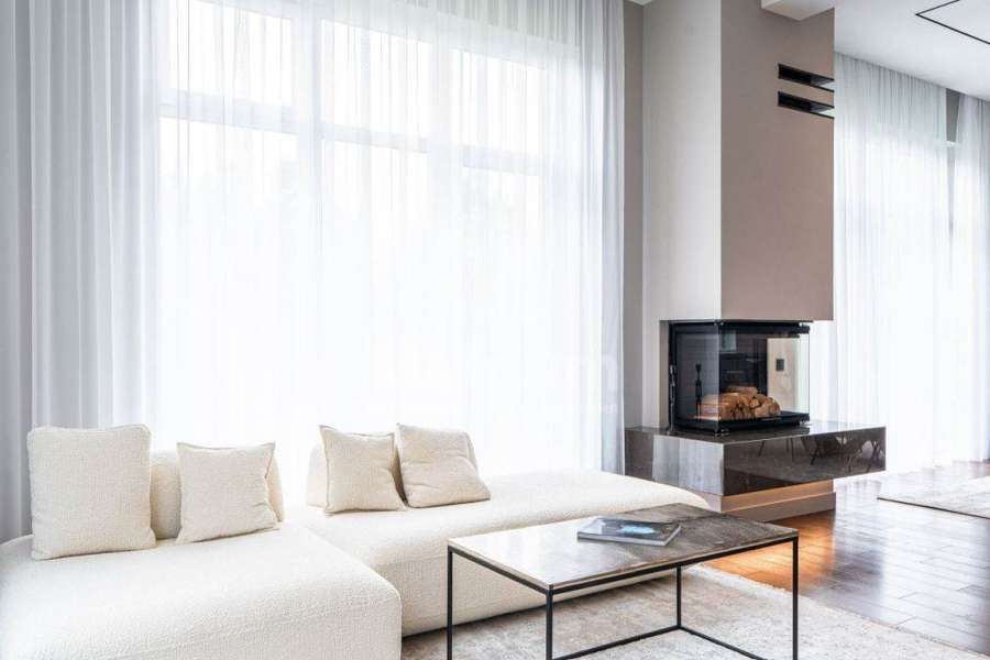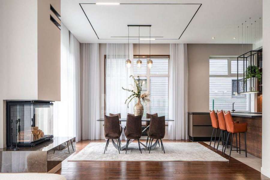 Кирпичный дом с высокими потолками (1 этаж - 3.8 м, 2 этаж - 6.60м). Полы - крупноформатный керамогранит, паркетная доска шпон натурального дуба, лестница - натуральный камень, стекло. Камин - дизайнерская трехсторонняя топка, натуральный мрамор. Подоконники также из натурального камня и шпона дуба. С/у - Villeroy&Boch, Grohe, Hansgrohe. В доме установлена приточно-вытяжная вентиляция с двойным фильтрованием, канальное кондиционирование, раздача воздуха в помещениях через скрытые решетки на потолках, в каждом помещении программируемый пульт для индивидуальной регулировки температуры. Возможность управления системами по wi-fi.