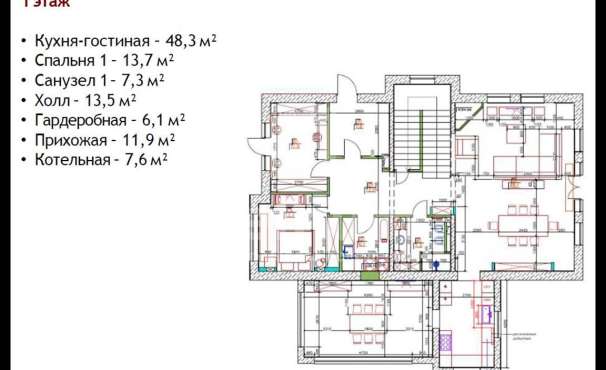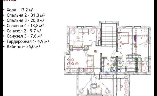 | Этажи/уровни: | 1 этаж: Кухня, столовая , гостиная, кабинет. Санузел. 2 этаж : 3 спальни с санузлами. Гардеробная. Есть мансарда. Около 30 м². |