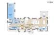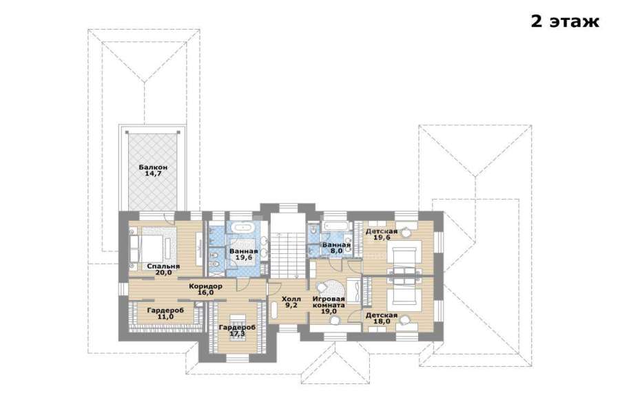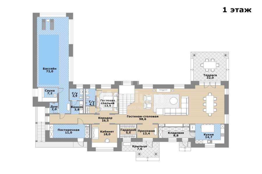 | Этажи/уровни: | Основной дом. 1 этаж: прихожая (13,4), гардеробная(5,5), гостиная-столовая (98,6) с выходом на террасу (32), кухня (14,7), кабинет (18), коридор (16,5), гостевая спальня (13,5) с с/у (4,2), постирочная (11), гостевой с/у (3,9), ванная (3,8), бассейн (72), сауна (2), душевая (2). 2 этаж: холл (9,2), мастер-спальня (20) с выходом на балкон (14,7), двумя гардеробными (11 и 17,3) и ванной (19,6), детский блок с двумя спальнями (19,6 и 18), игровой (19) и ванной (8). Цокольный этаж: технические и подсобные помещения. Гостевой дом. 1 этаж: гараж (84,6), с/у (2,5), котельная (15,8). 2 этаж: кухня-гостиная (39,9), 2 спальни (15,4 и 15,4), с/у (5,5), коридор (6,2 + 1,4), комната свободного назначения (16,5). |