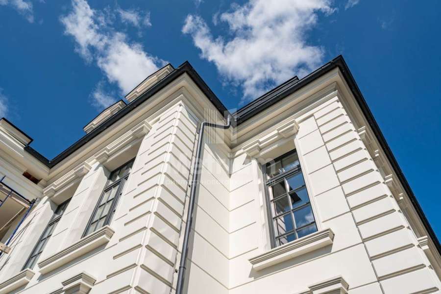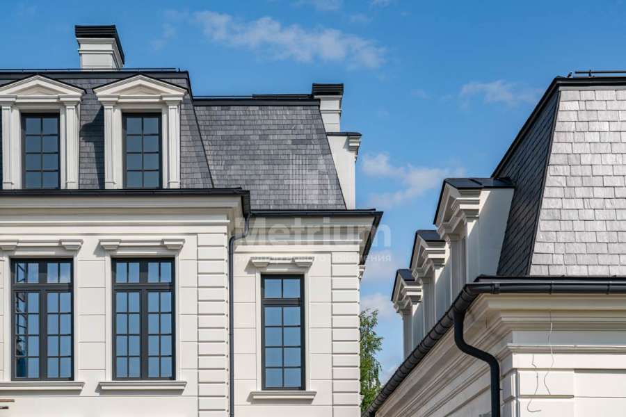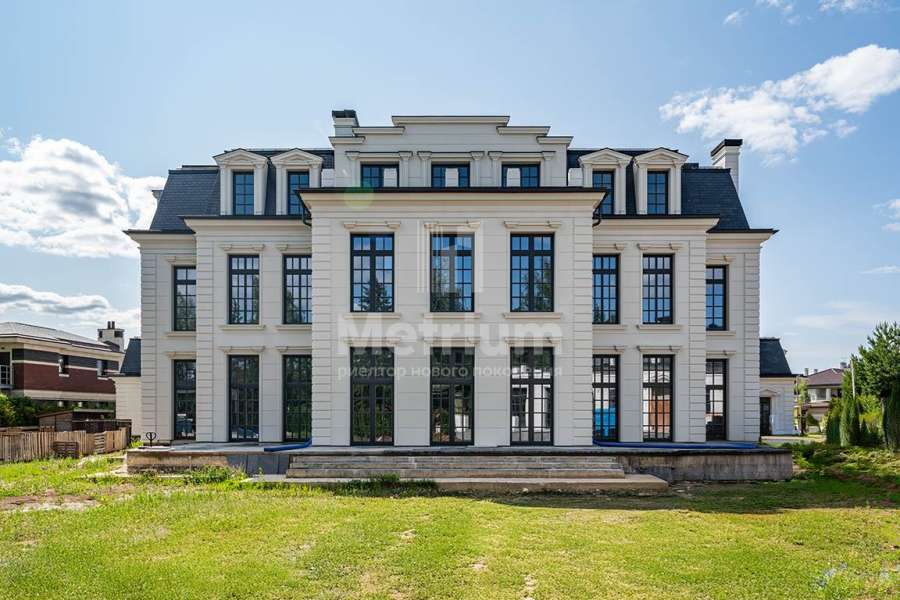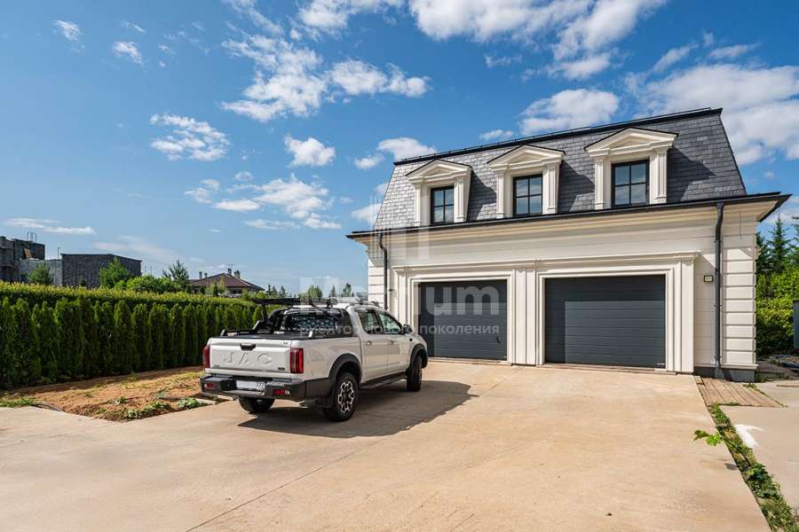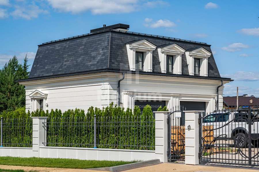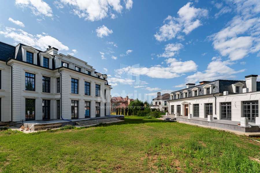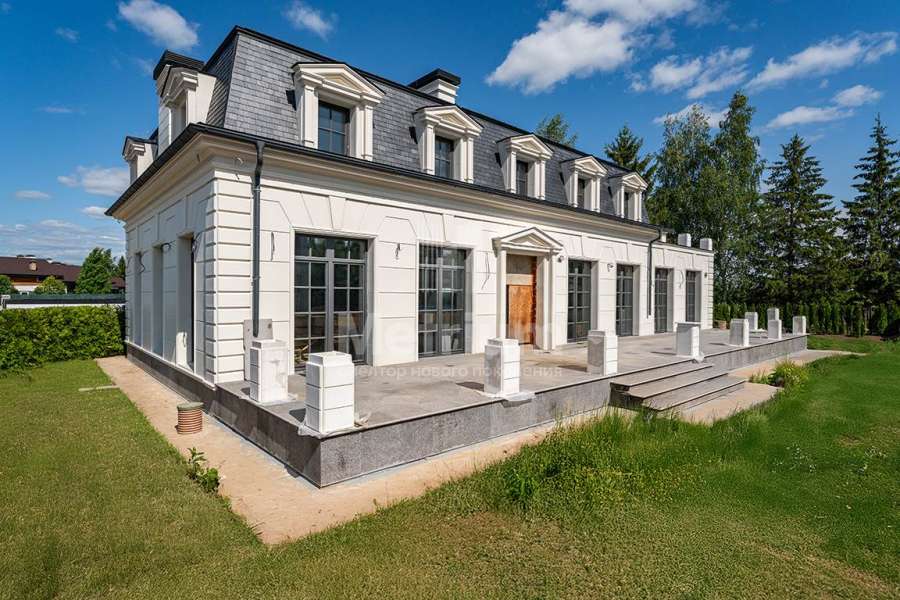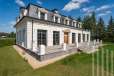 Дом в стиле французской классики с бассейном около озера в "Миллениум парке" на Новой Риге. 6 спален, общей площадью 1700 кв.м., расположен на участке 35 соток с собственным выходом к озеру. Из окон дома открываются виды. Дом построен из поризованного кирпича Porotherm в 3 этажа и представлен под отделку.