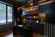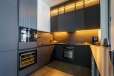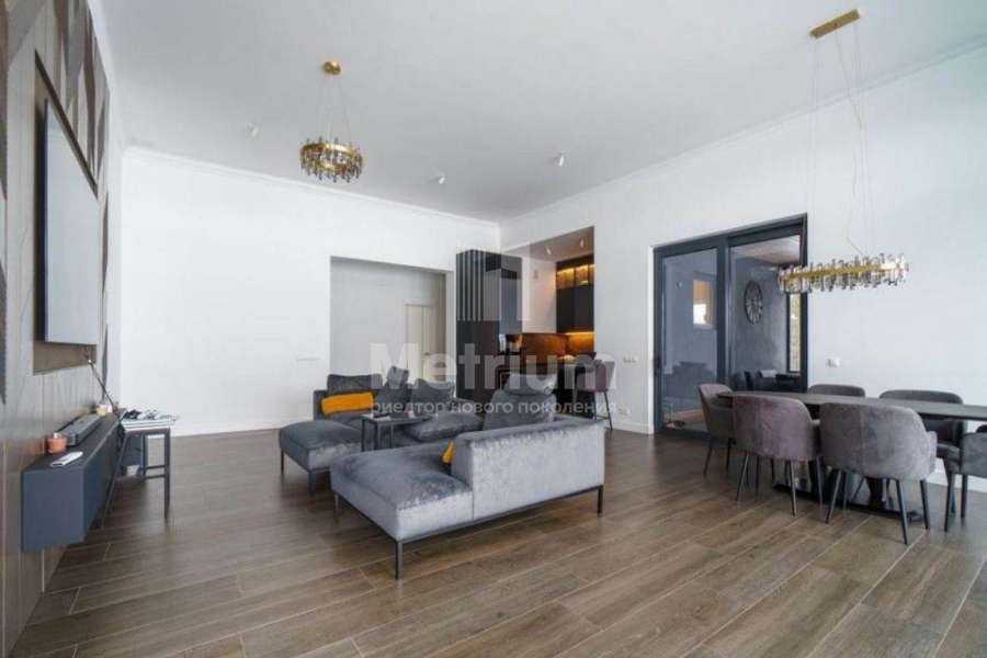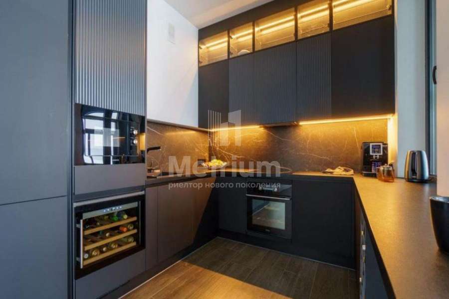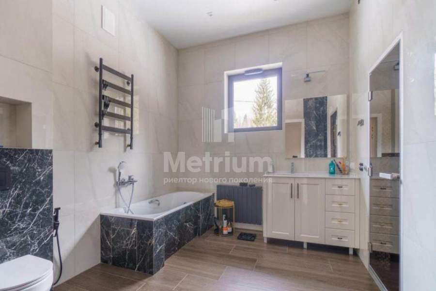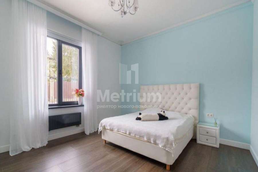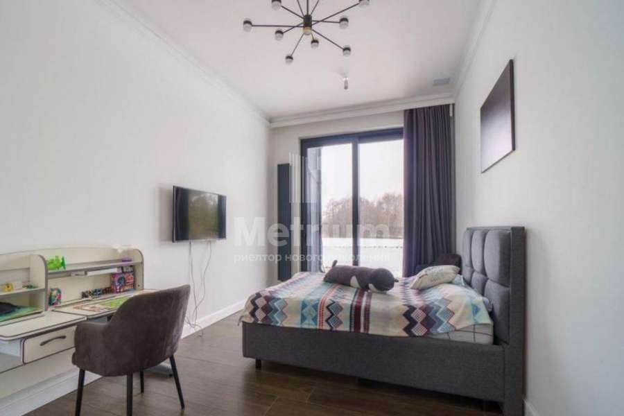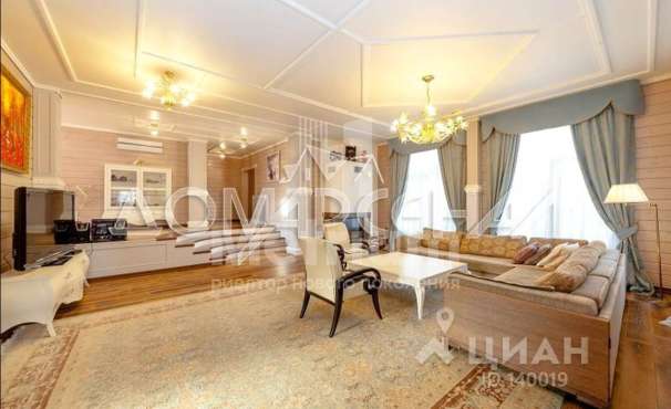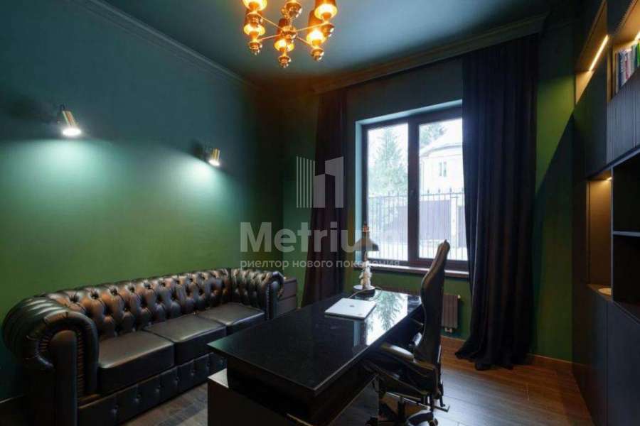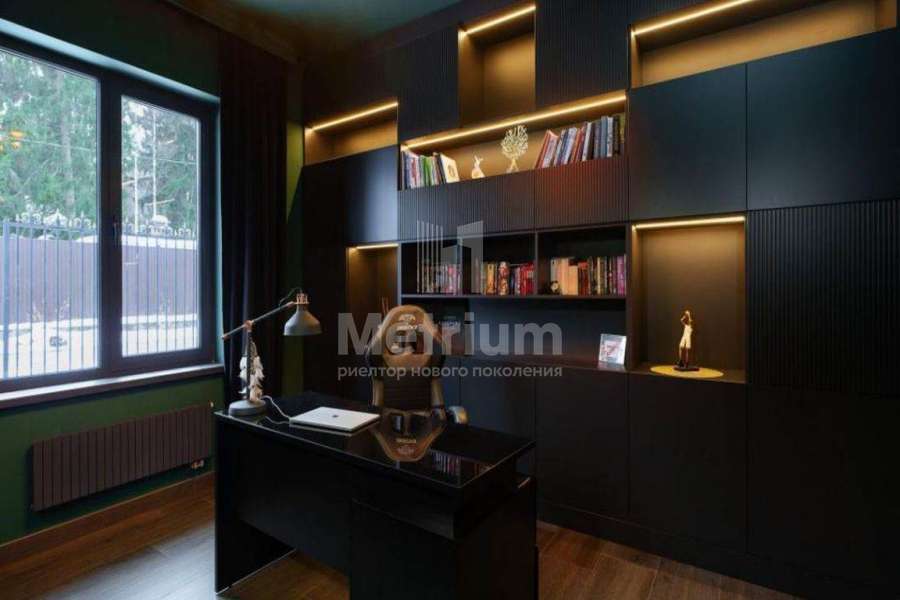 Мебель, оборудование: дом полностью укомплектован мебелью, выполненной на заказ. В прихожей большой гарнитур до потолка, с пуфом, вешалкой, ящиками для мелочей и 5-ти створчатым шкафом для одежды. Кабинет оборудован выполненным на заказ шкафом во всю стену, черного цвета (в едином стиле с кухней), также черного цвета стол со стулом и кожаный диван (каретная стяжка). Дизайнерская кухня черного цвета с полубарным столом, витражами, укомплектованная техникой, включая духовой шкаф, винный шкаф, холодильник, варочную поверхность, СВЧ, винный холодильник. В гостиной-столовой стол со стульями на 8персон, большой ТВ (75 дюймов), консоль под ТВ, большой диван и журнальный столик. В спальнях - двухспальные кровати и другая мебель. В доме современное освещение: есть спрятанная за карнизом светодиодная подсветка, люстры в стиле ар-деко, встроенное в потолок линейное освещение, направленные потолочные светильники.