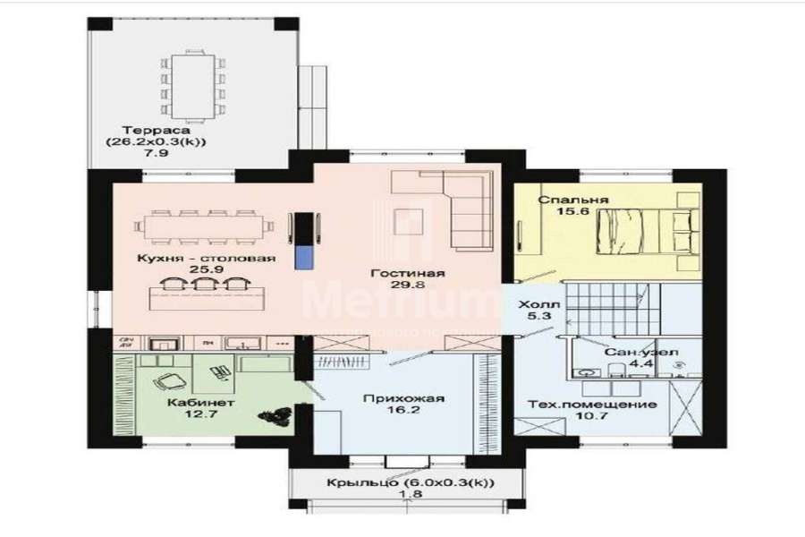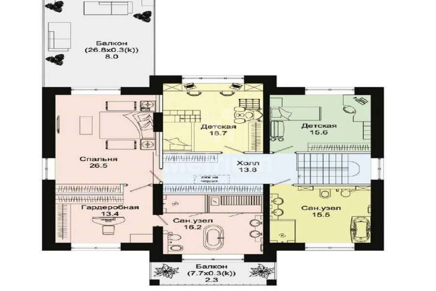 | Этажи/уровни: | На первом этаже, общей площадью 152,8 кв.м, разместилась большая гостиная, совмещенная с кухней-столовой. Из нее можно попасть в кабинет и на крытую террасу. Здесь же находится уютная спальня для гостей. На первом этаже расположено техническое помещение с санузлом. На втором этаже, общей площадью 154.2 кв.м, комфортно организованное пространство дома «Марсель» составляют: большая спальня площадью 26,5 кв.м с собственной гардеробной и ванной комнатой, 2 детских с санузлом. Из мастер-спальни есть выход на просторный балкон, откуда открывается красивый вид на поселок. |