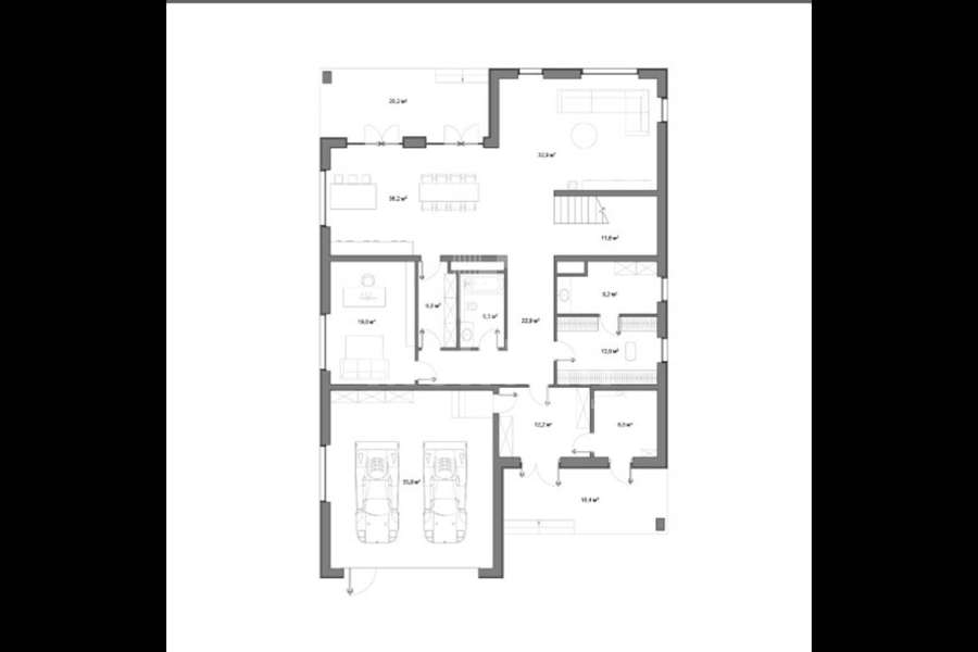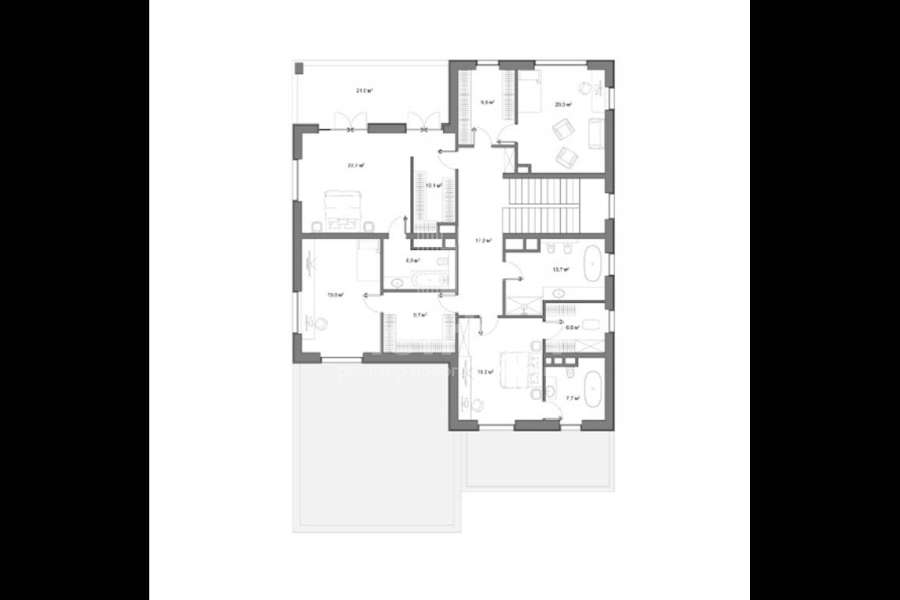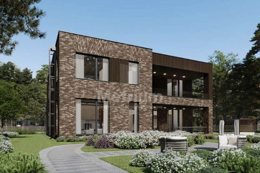 За счёт смещения объёмов и разнонаправленности кирпичной кладки экстерьер смотрится представительно и актуально. Функциональная планировка позволяет разместить на первом этаже просторную кухню-гостиную, кабинет, ванную комнату и гардеробную, а также хозяйственные помещения: полностью оборудованную котельную и кладовую. В зоне гостиной предусмотрено место для установки камина, здесь же находится выход на личную террасу. На втором этаже расположены мастер-спальня, две детские, а также две гардеробные и ванные комнаты.