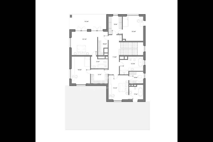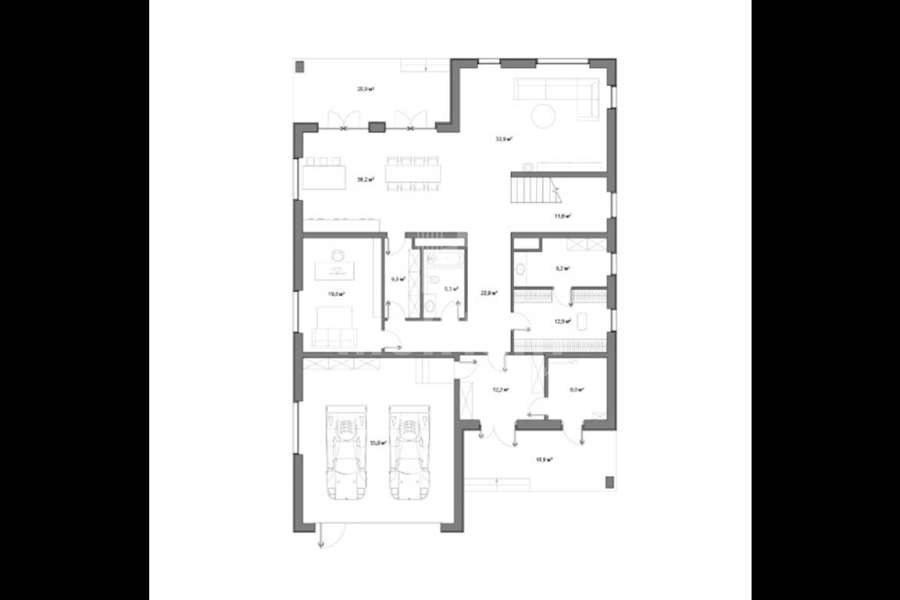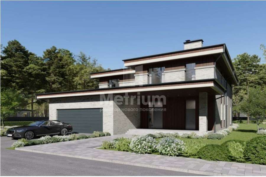 За счёт смещения объёмов и разнонаправленности кирпичной кладки экстерьер смотрится представительно и актуально. Функциональная планировка позволяет разместить на первом этаже просторную кухню-гостиную, кабинет, ванную комнату и гардеробную, а также хозяйственные помещения: полностью оборудованную котельную и кладовую. В зоне гостиной предусмотрено место для установки камина, здесь же находится выход на личную террасу. На втором этаже расположены мастер-спальня, две детские, а также две гардеробные и ванные комнаты.