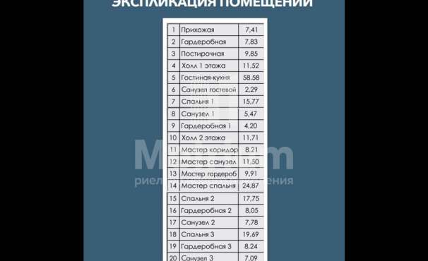 | Этажи/уровни: | 1 этаж: прихожая, гардеробная кухня-гостиная, спальня с гардеробной и санузлом, с/у гостевой, постирочная. 2 этаж: холл, мастер спальня с гардеробом и с/у-3 шт. |