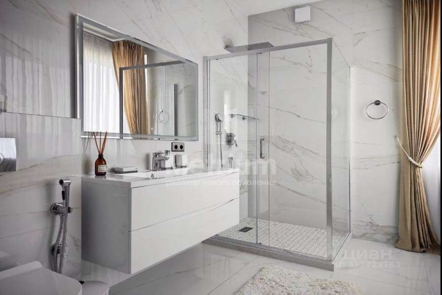 Этот дом отличается качественной отделкой и удобной планировкой, включающей просторную кухню-гостиную, четыре спальни, каждая из которых оснащена собственным санузлом и гардеробной. Также предусмотрена терраса и навес для двух автомобилей.