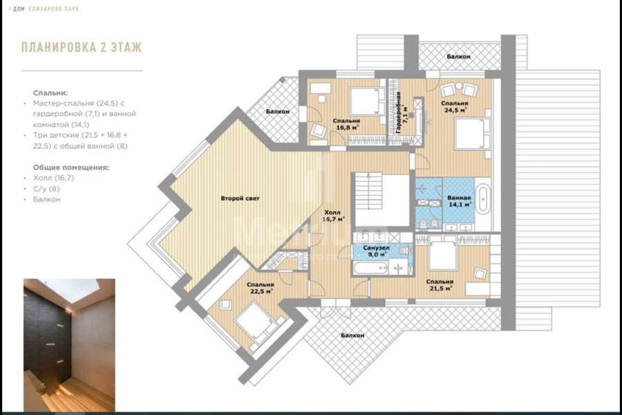 | Этажи/уровни: | 1 этаж: терраса, прихожая (9,2) с гардеробной (9,1) и гостевым с/у (5), объединенная кухня-столовая, гостиная (87) и выходом на террасу с видом на лес, кабинет (14), спа-зона с бассейном (53,3), сауна (8,3), душевые и с/у (1,4), гараж на 2 м/м (33,6), лестничный холл (13,2), постирочная (8,8), котельная (9,6), гостевая спальня (15,2). 2 этаж: мастер-спальня (24,5) с гардеробной (7,1) и ванной комнатой (14,1), три детские (21,5 + 16,8 + 22,5) с общей ванной (8), холл (16,7), с/у (8), балкон |
