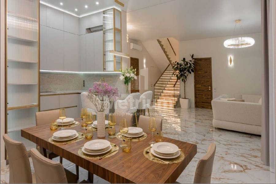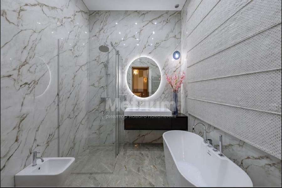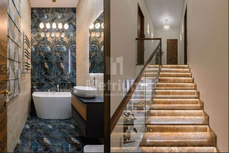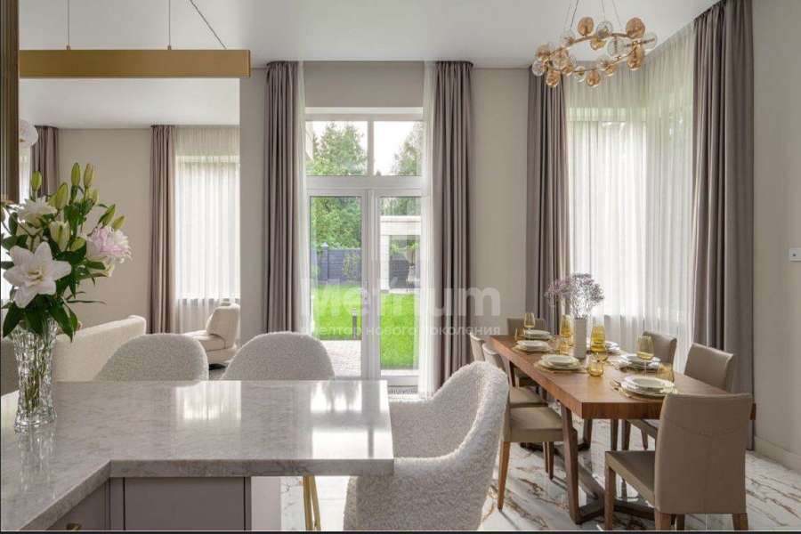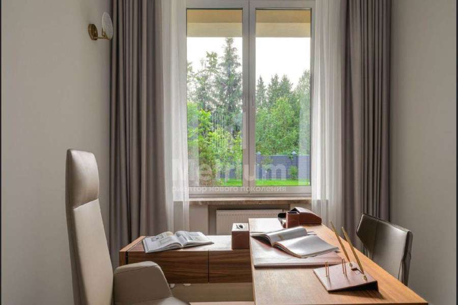 Фасад дома облицован натуральным камнем, цоколь выполнен из гранита, въездная группа, терраса и дорожки вымощены из брусчатки. Дом полностью меблирован, отделка в доме выполнена с использованием высококачественных материалов - ценных пород дерева, шпона, натурального камня, мрамора, текстиль премиального качества, уровневое освещение, встроенная мебель индивидуального изготовления. Установлена система вентиляции с климат-контролем в каждом помещении.