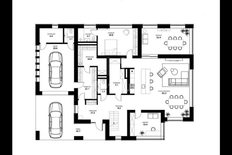 Дом предлагается в отделке white box. Планировка продумана до мелочей, обеспечивая эффективное использование пространства. Большие панорамные окна наполняют интерьер естественным светом, визуально расширяя пространство и создавая ощущение единения с природой.