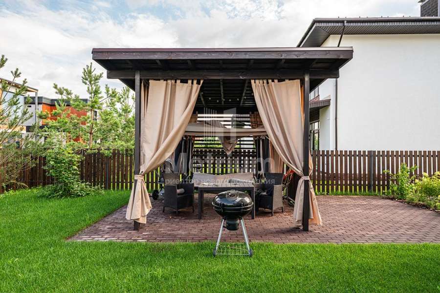 На ухоженном участке 6 соток расположена зона для отдыха- беседка и гриль! Также для удобства предусмотрен навес на 2 машиноместа.