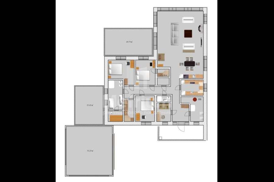 | Этажи/уровни: | 1 этаж: холл, гостевой с/у, серверная, гардеробная, спальня- 3 шт, гардеробная, с/у, кухня-гостиная, террасы-3 шт. |