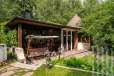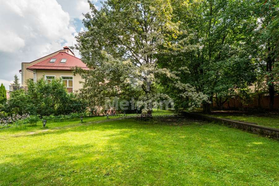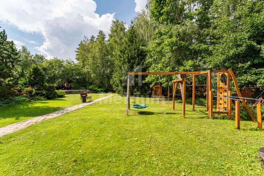 На просторном участке 35 соток растут многолетние деревья, вымощены дорожки и организована детская зона для игр.