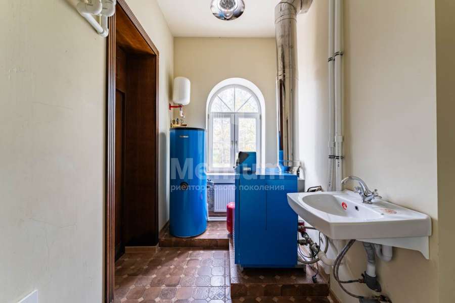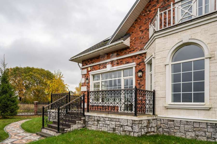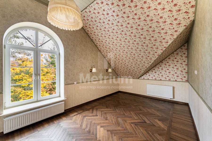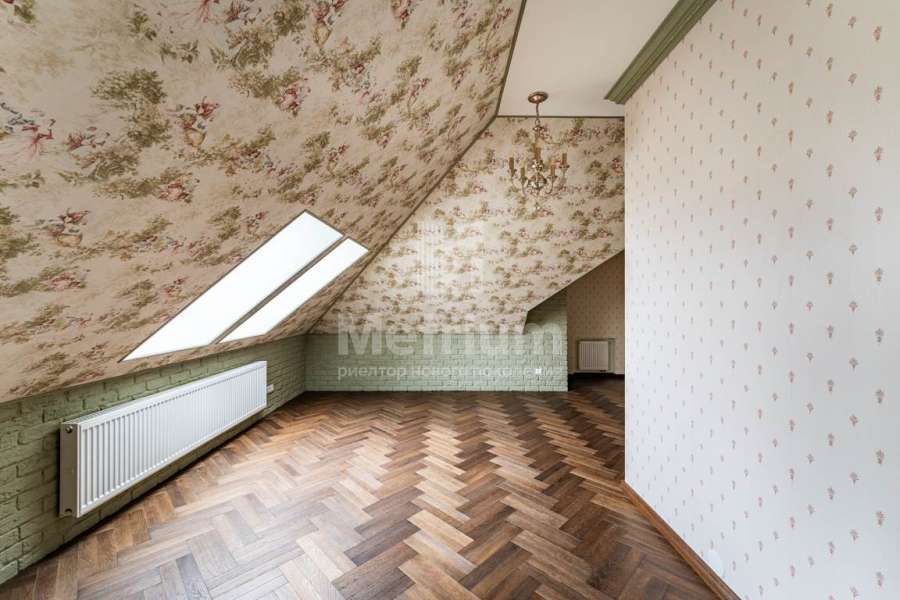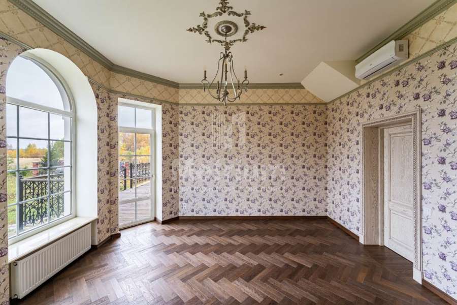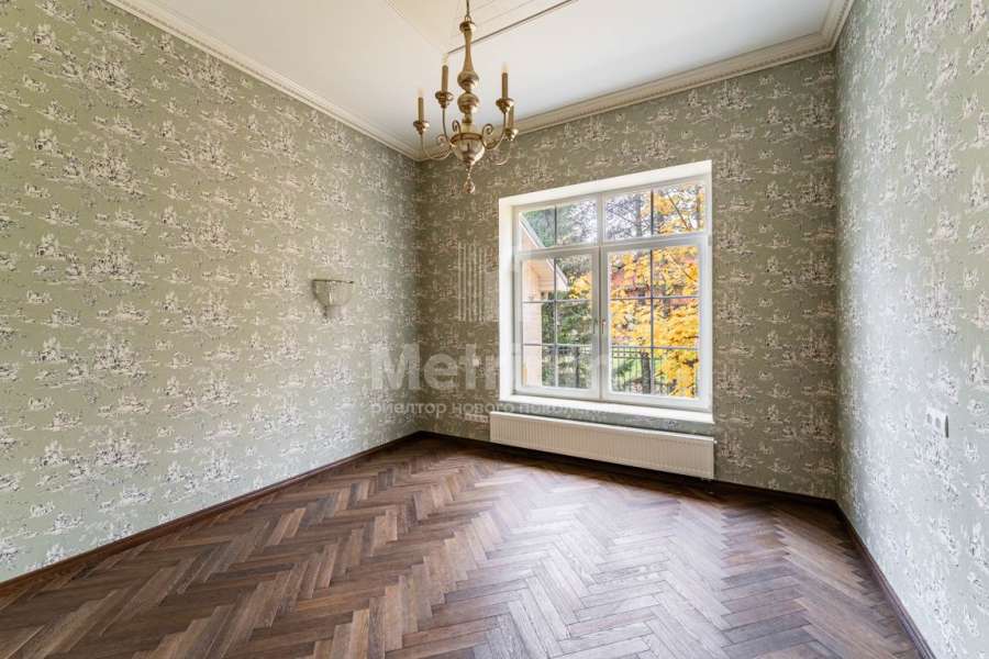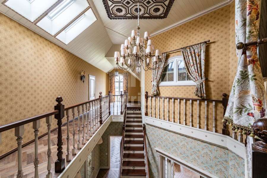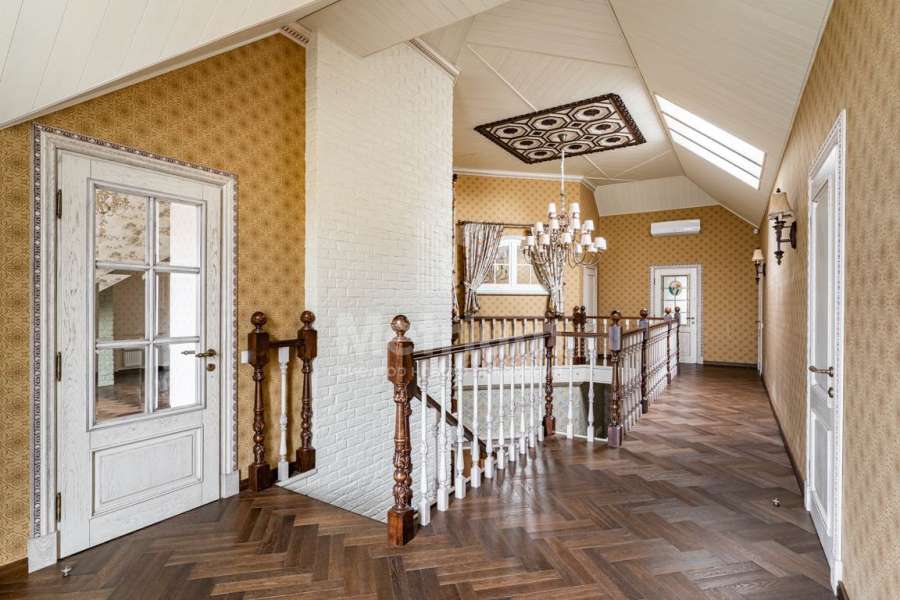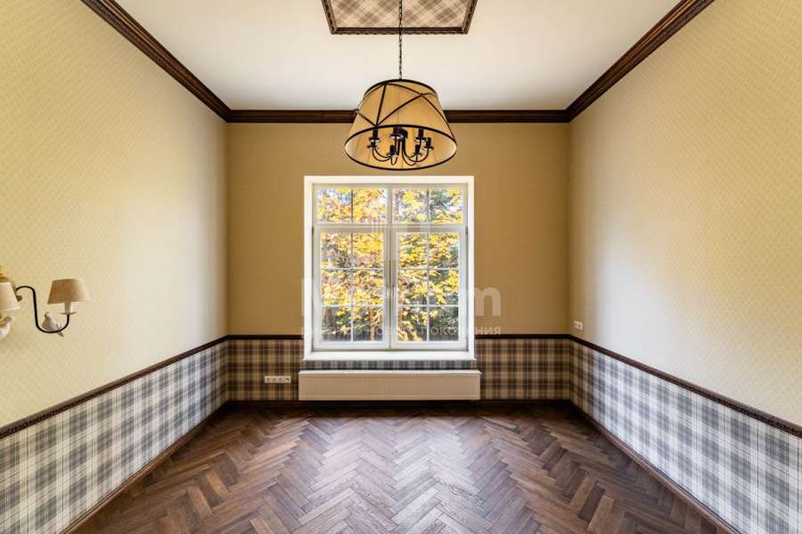 В отделке дома использованы только высококачественные натуральные материалы: бумажные английские обои, дубовый паркет и плинтус, двери и лестница из массива дуба, деревянные потолочные карнизы и резные панно. Высота потолков первого этажа – 3,2 м.