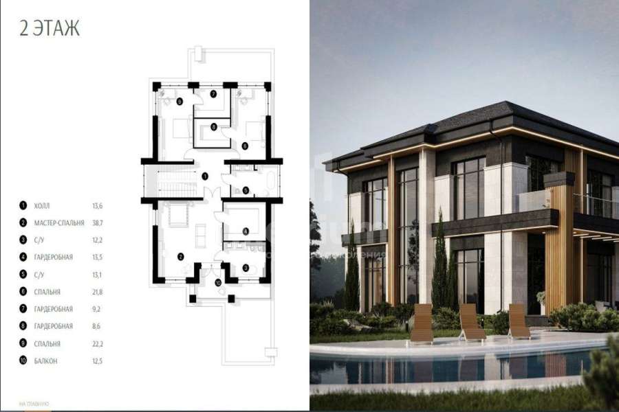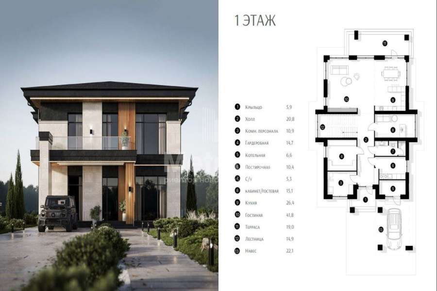 | Этажи/уровни: | 1 этаж: крыльцо, холл, комната персонала, гардеробная, котельная, построчная, с/у, кабинет/гостевая, кухня, гостиная, терраса, лестница, навес 2 этаж: холл, мастер-спальня с с/у и гардеробной, с/у, спальни с гардеробной-2 шт, балкон. |