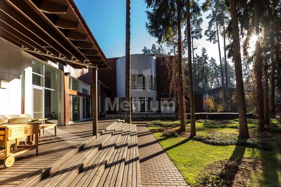 Дом расположен на ухоженном лесном участке с ландшафтом, система полива разведена по всему участку.